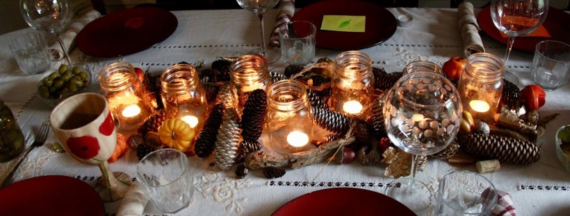 - When it’s time to set your table light the candles and put them in the Mason Jars. You can light them right before dinner, but as you set up things will be resting on the jars and when you remove them to put the candles out and in again everything will tip over and need to be re-set a bit.