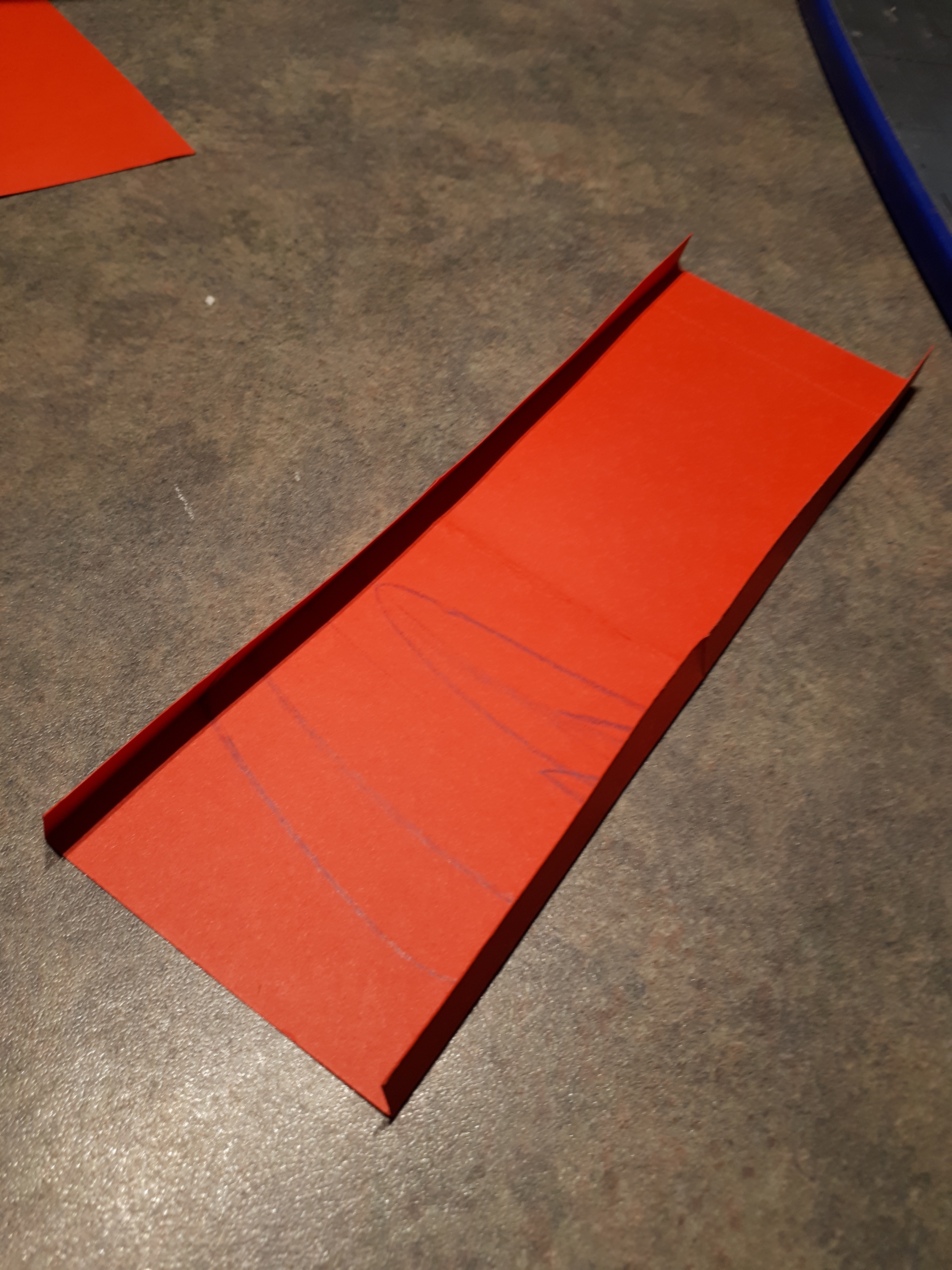 - Cut one piece of red card stock into three, so each piece is approximately 3.5 inches by 8 inches.