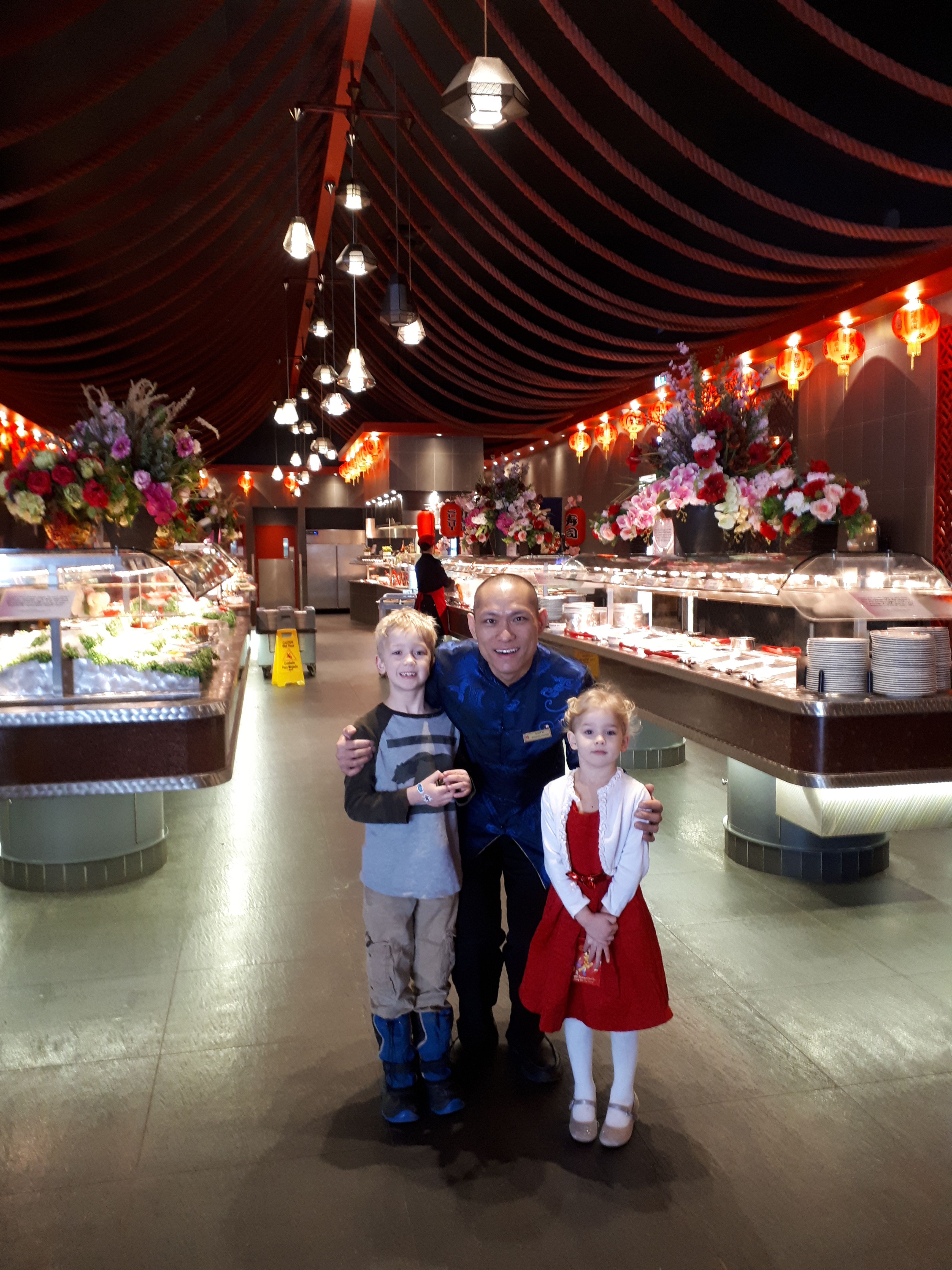 We began with those lovely hot cloths (the kids thought that was so cool!), then swiftly moved on to food! Our first time around the buffet we had traditional Chinese New Year good fortune foods: dumplings, long noodles and shrimp. The next time around I told the kids they could get whatever they wanted, which consisted mostly of pizza (lame), and A LOT of dessert! The whole time the servers kept filling our water glasses, clearing our extra plates, and asking how things were. One man even got my daughter replacement garlic bread and shrimp when she dropped her plate on the floor. And Oliver came and checked in on us once! The kids kept saying, “The people here are so nice!”