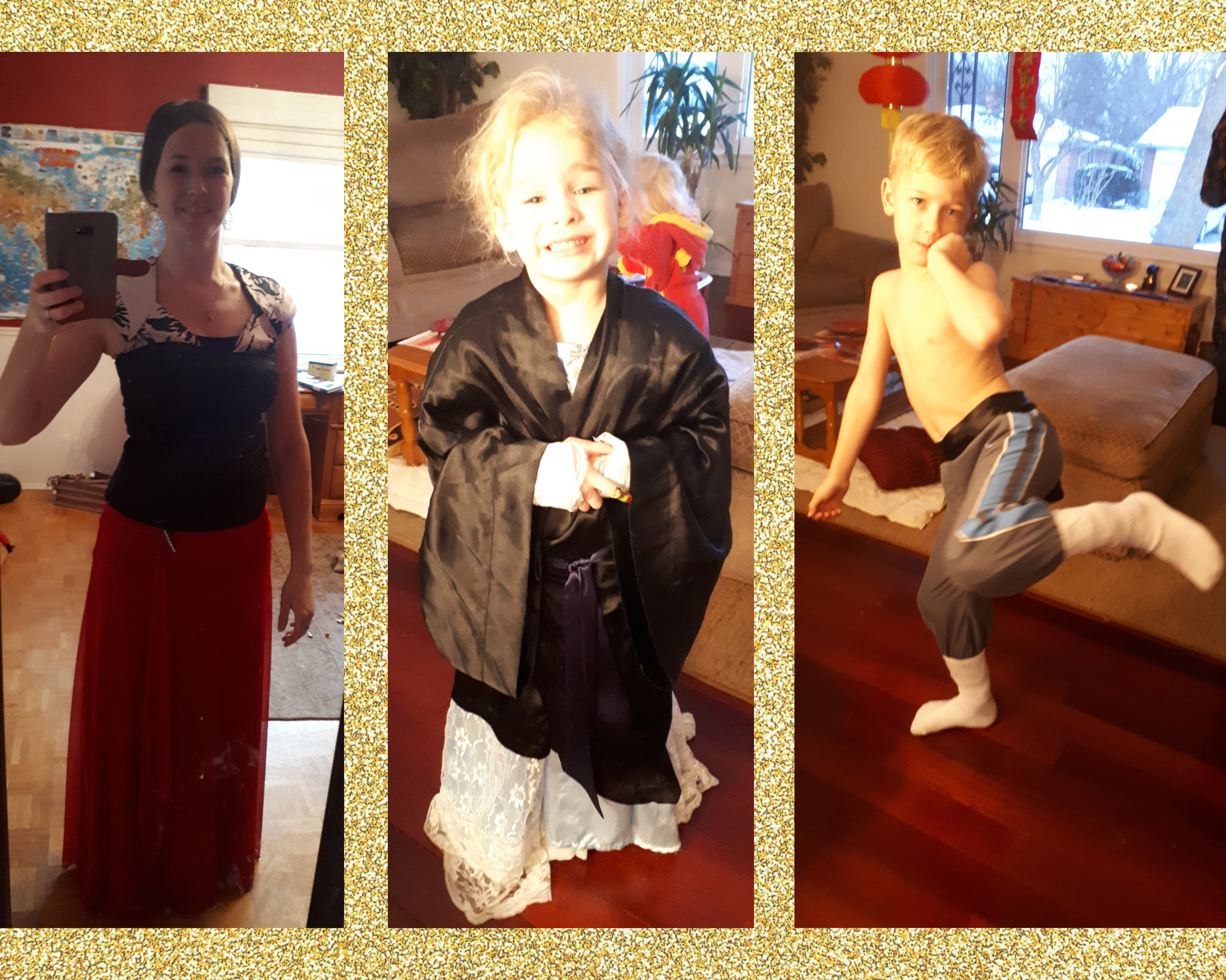 As you can probably tell (or maybe not, haha!), we relied heavily on Mulan for our costumes! We watched Mulan the night before and it was inspirational! My son is Shang, and I tried to copy Mulan’s basic outfit with the long skirt and shirt under a wrap thing. Everyone else in the family wore housecoats. I gleaned a lot of information from Yuqi Jiang at Traditional Chinese Clothing.