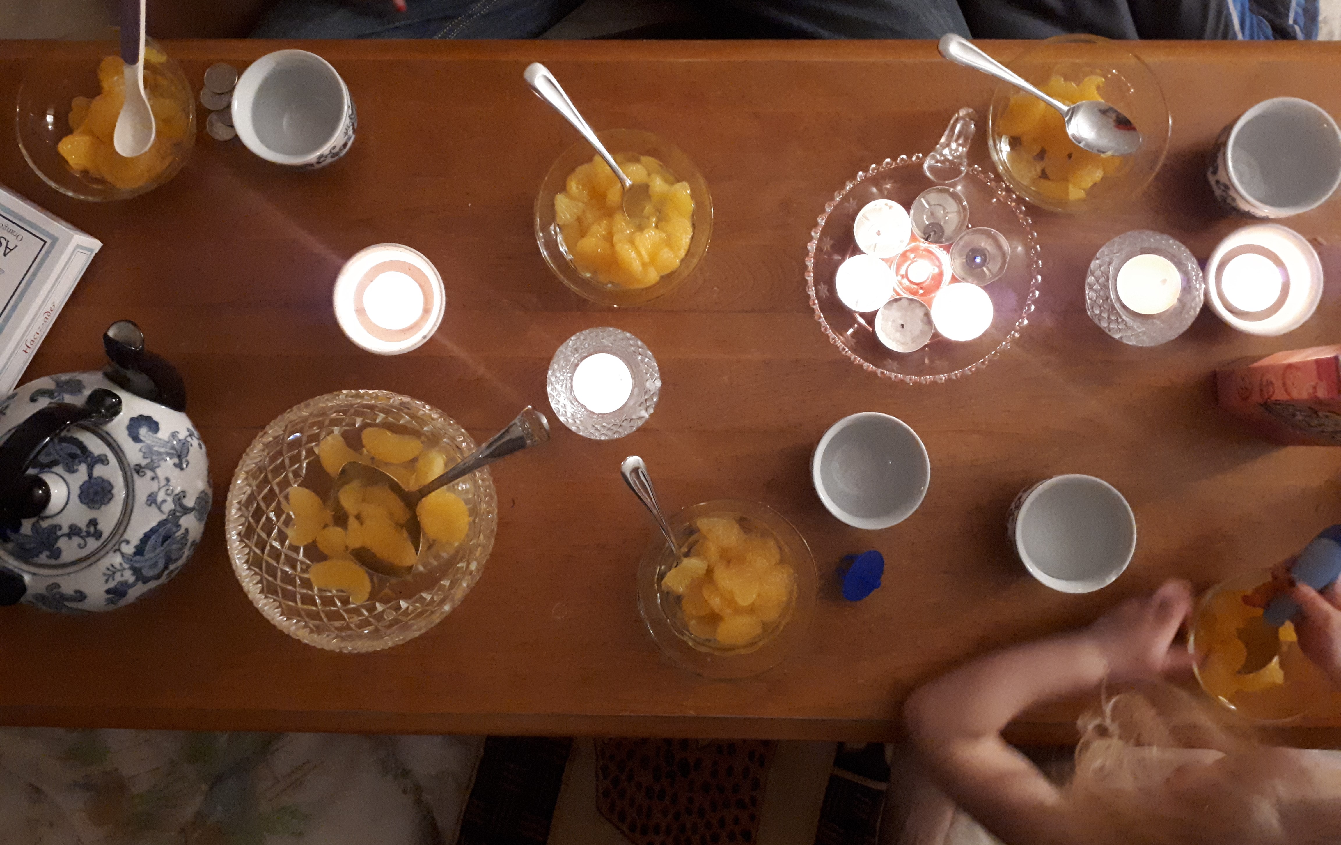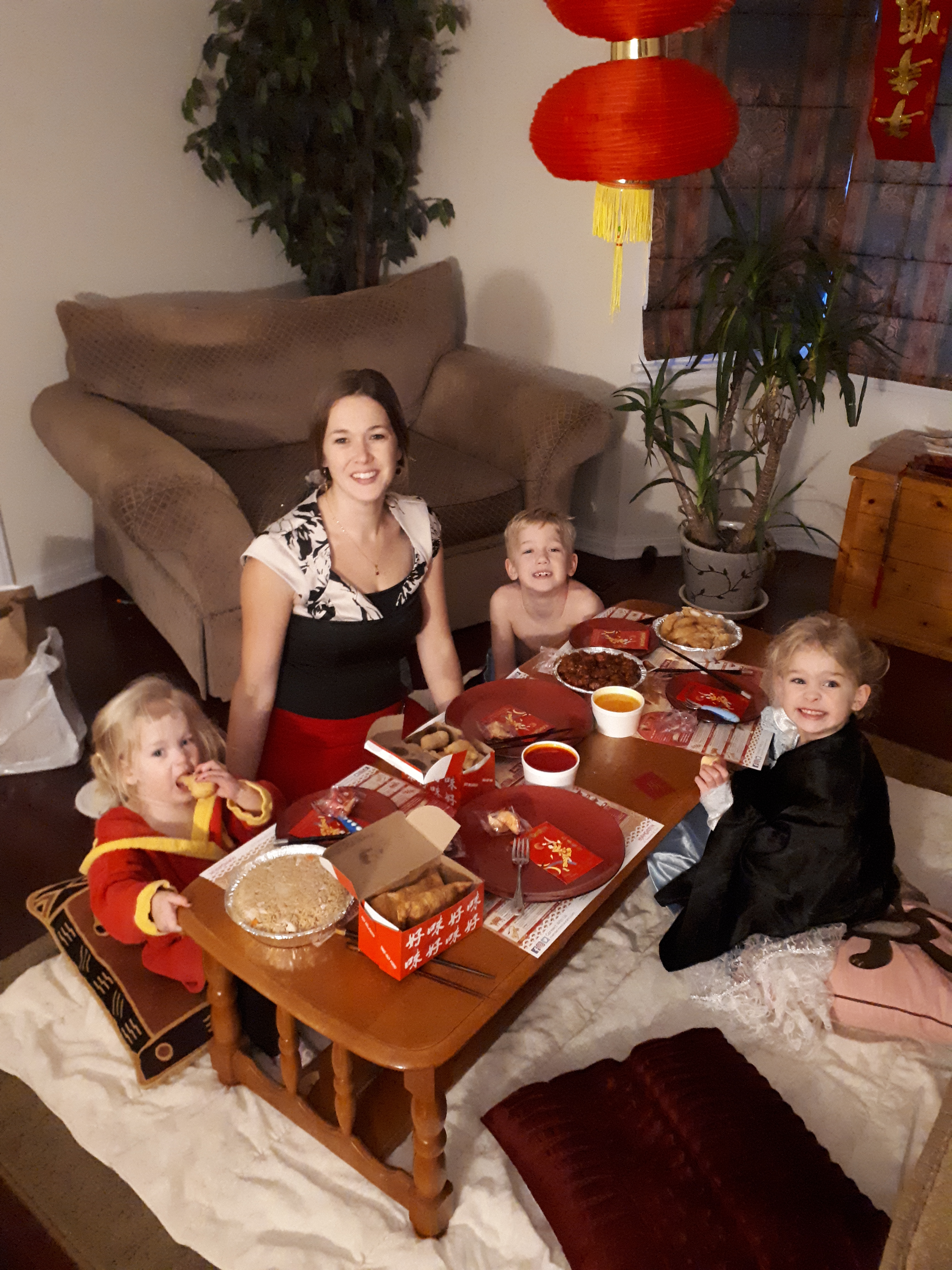 We had Chinese take-out for our main course, and then tinned mandarin slices for dessert. We also added some Chinese cookies that we got at the Chinese grocery store. Super simple. Super delicious!