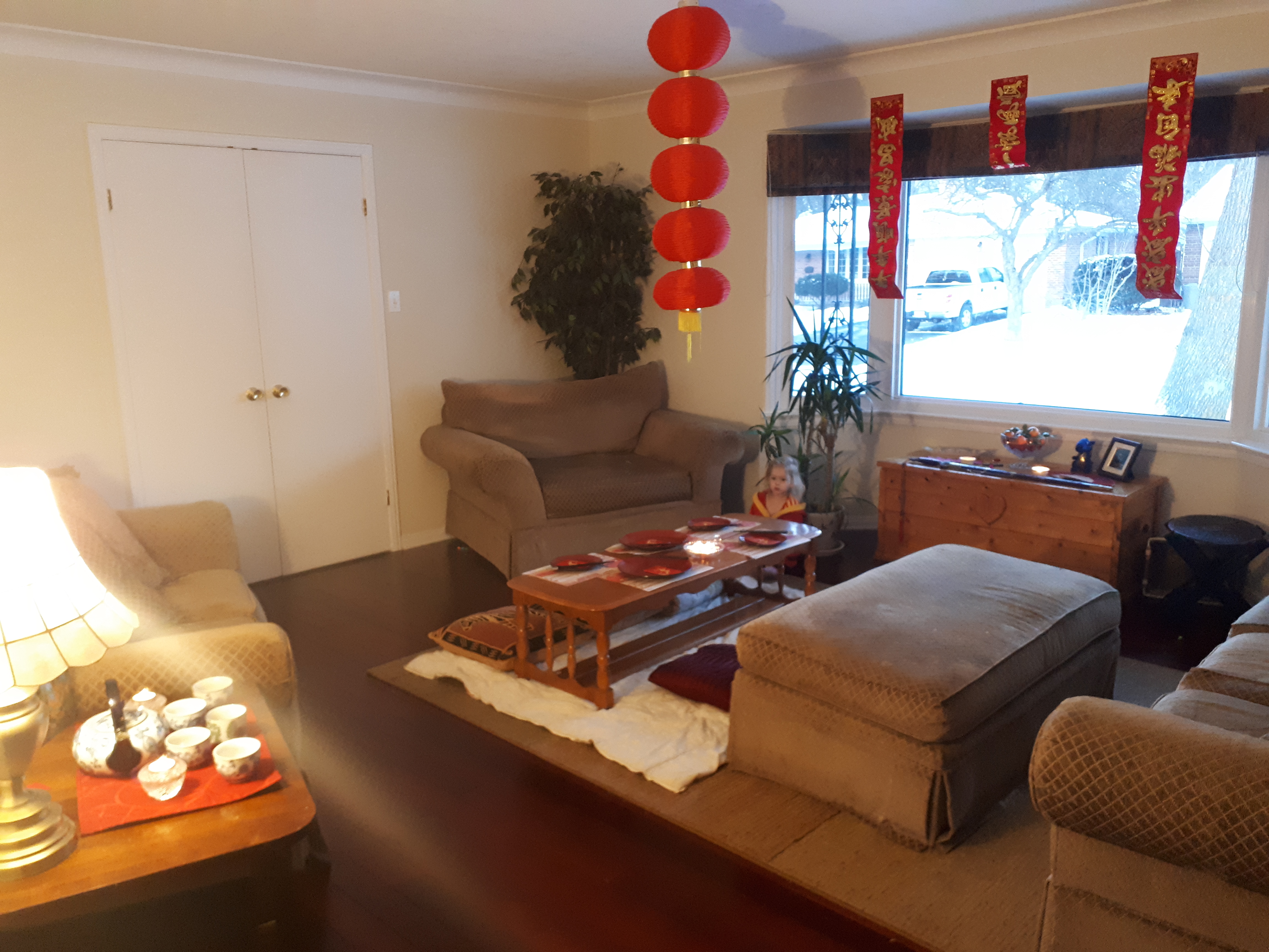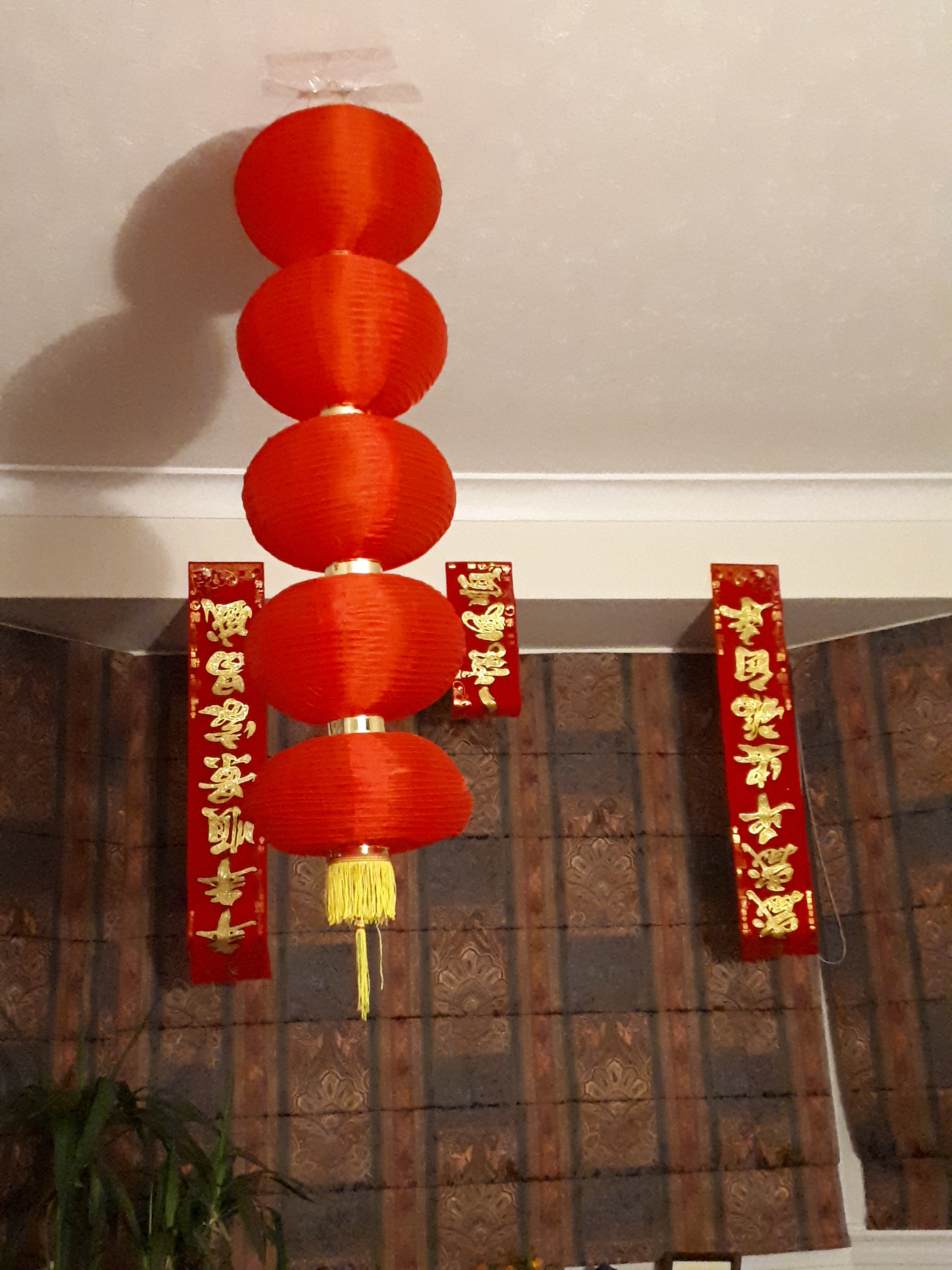 We got these hangings and lantern at the grocery store that morning. There were no English instructions on the banners, so I fully expect someone who speaks a Chinese language to tell me that they’re upside down, or should be horizontal. But, I did my best! And they look good that way, don’t they?