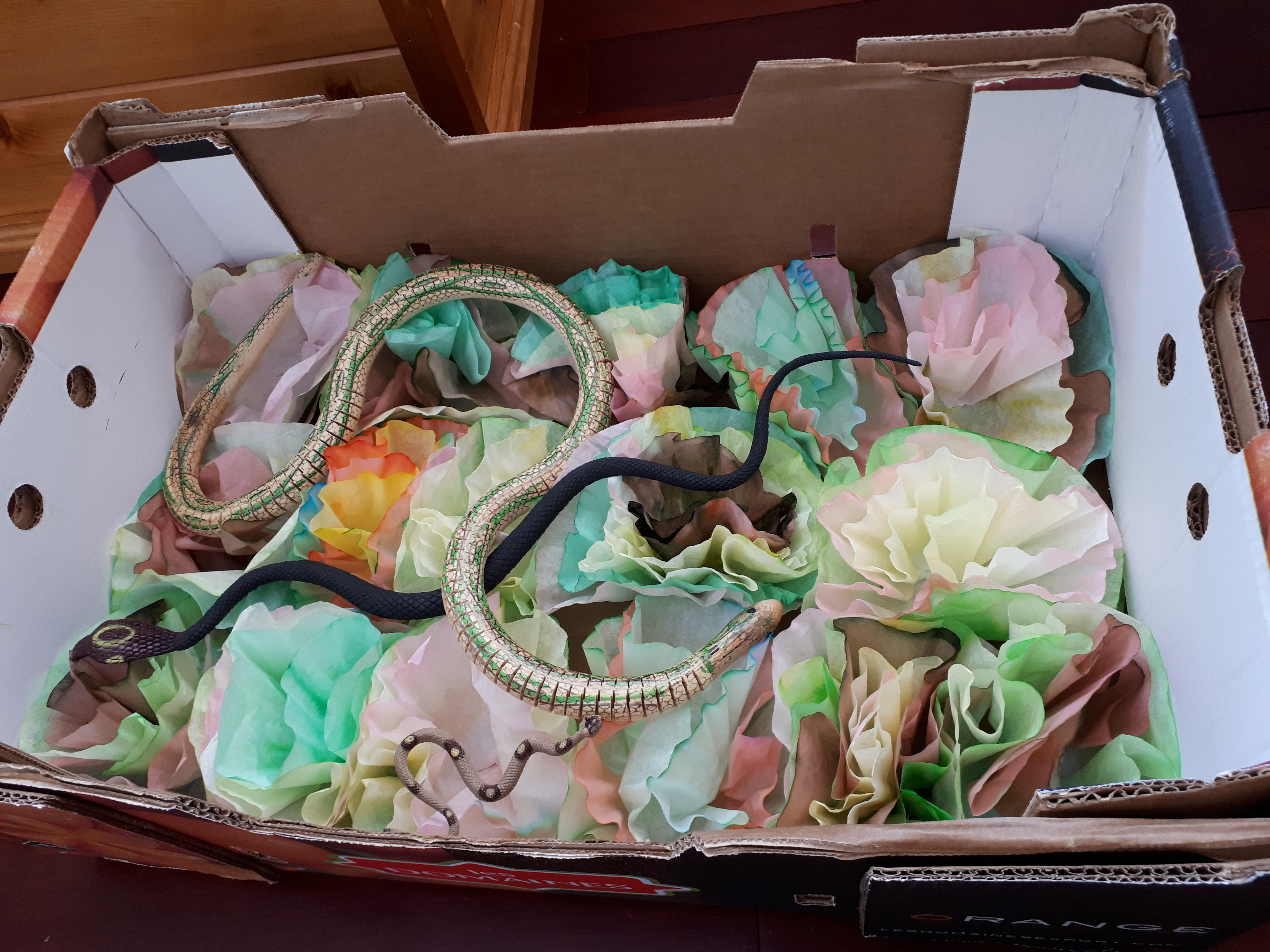 My son is all about nests. All of his animals need nests, and when he goes to bed at night he always asks us to make a nest out of his blankets. He often goes to bed all wrapped up in pillows and blankets, and when we check on him before bed he is COVERED in sweat! Anyway, we were at Dollarama a couple of days ago buying supplies for my daughter’s Under the Sea party- that post will be coming soon!- when my son found a long wooden snake; the kind that sways back and forth. Since then he’s been asking me to make a nest with him, and today is the day that we got it. And man did it ever turn out! We used the same technique that we’re going to use to make the coral reef for our Under the Sea party- putting coffee filters in a bit of water and food colouring and having it soak it up. Then you dry it out, stick them together and glue them into a box. This nest is meant to look like grass and twigs, the kind of habitat a snake would like. You can change the colours to make other types of nests. Keep reading for a full tutorial!