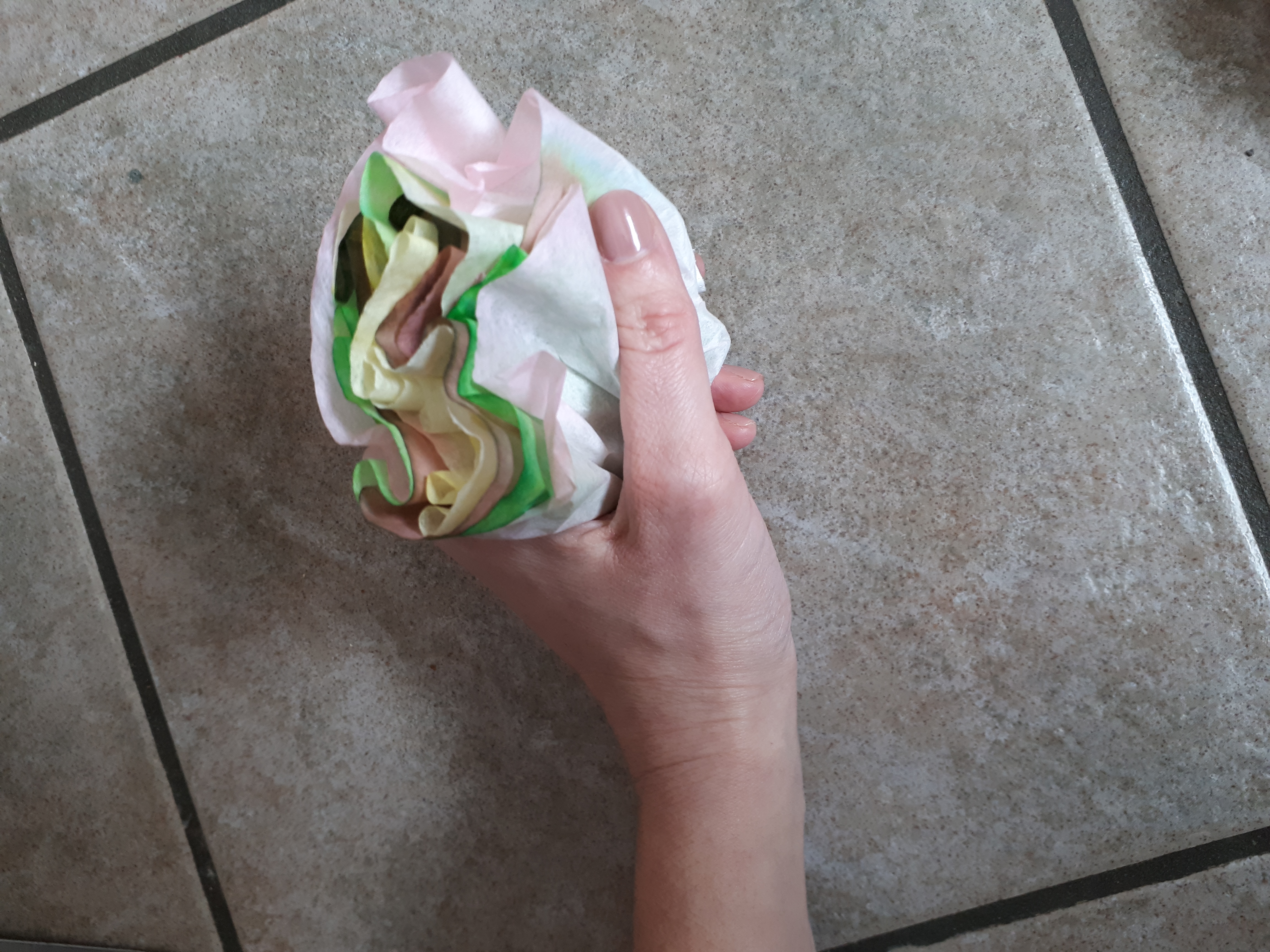 2. Put the coffee filters upside down on the plate and watch as the water is soaked up. This was really cool to see- even for me! Because there is so little water you may have to swirl it around a bit, and then even turn the filters upside down to finish the bottoms. You could just use more food colouring and water, but that seemed like unnecessary waste to me. When the filters are done place them on a cookie sheet, or something similar, for them to dry. Our filters took about 24 hours to dry. As they were getting close to dry I separated them all to hasten the process a bit. Learn from my mistakes: if you put wet coffee filters close together they’ll bleed onto each other. Some of my lovely yellow filters have huge bright green splotches on them.