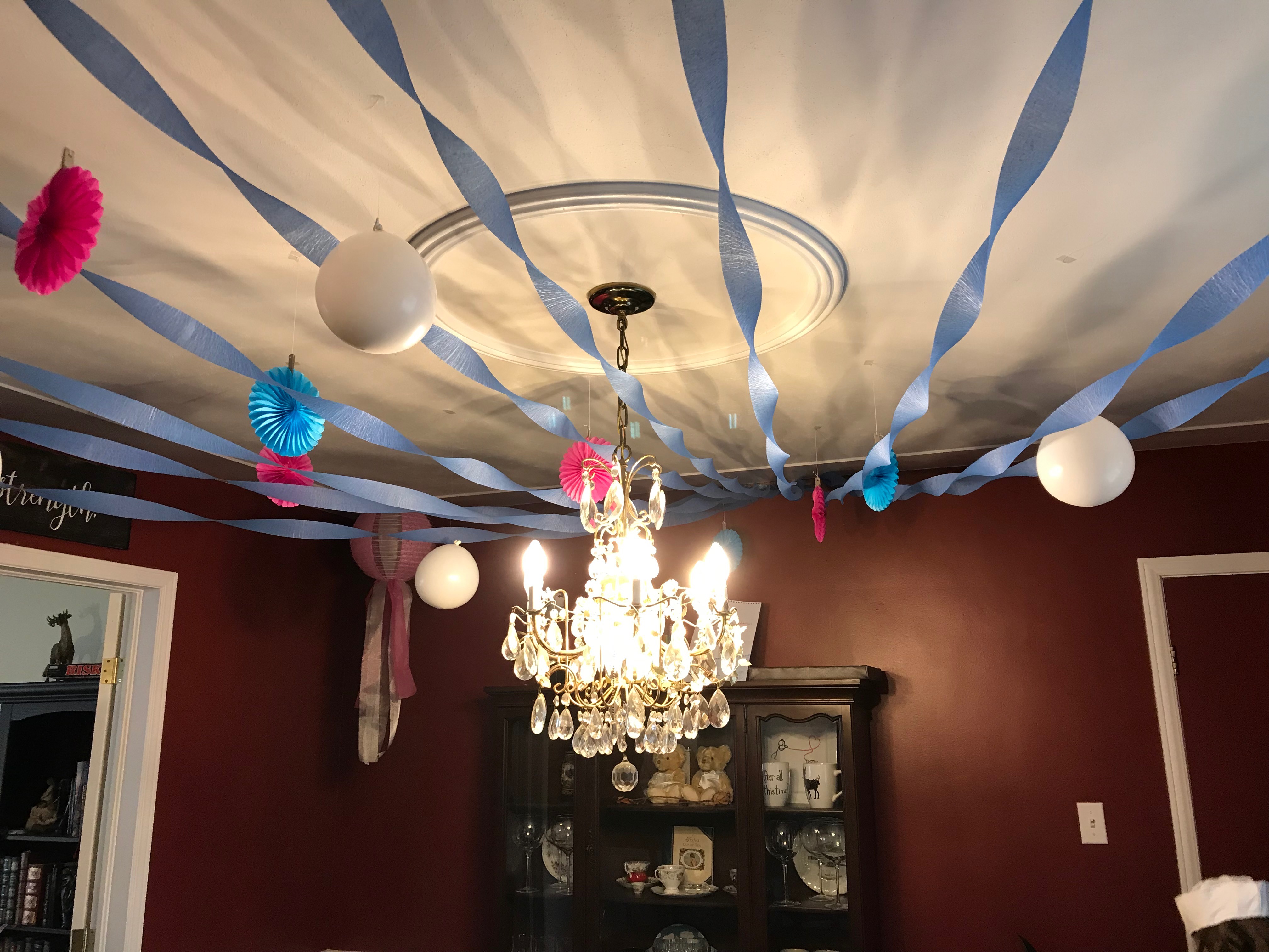 The streamers are taped right together on one side of the room, and fanned out to the other to look like a wave. I got the paper flowers from Dollarama, and the white balloons are supposed to be bubbles.