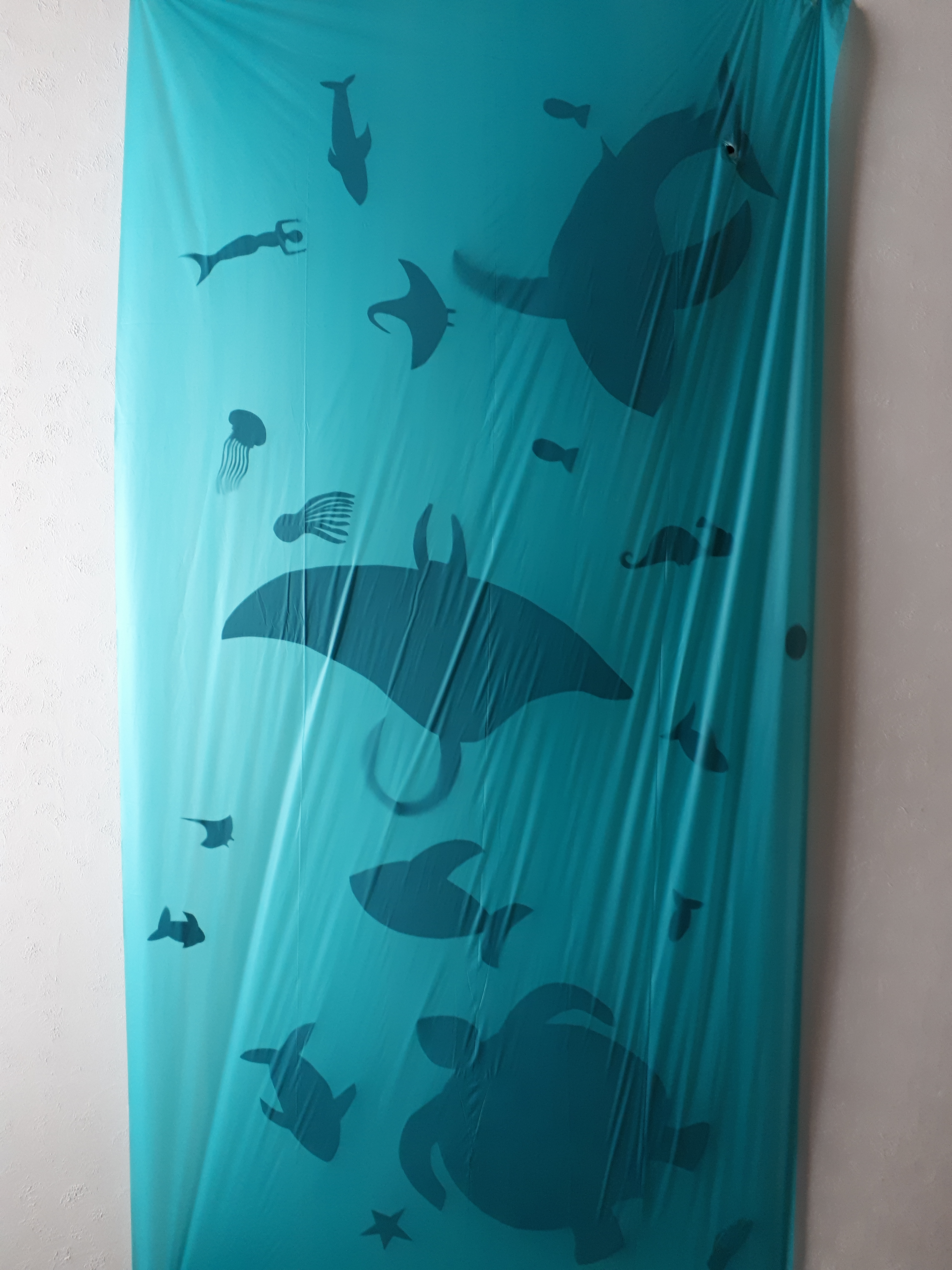 This idea is so awesome and so easy – even if you aren’t artistic. My sister and I sat and had a cup of tea while cutting silhouettes (fish, shark, turtle, stingray, squid, octopus, starfish, seahorse and even a mermaid) out of black bristol board. You then just tape a blue plastic table cloth to the ceiling and throw the sea creatures on top. I saw this idea at a Vacation Bible School my son went to. Isn’t it amazing?