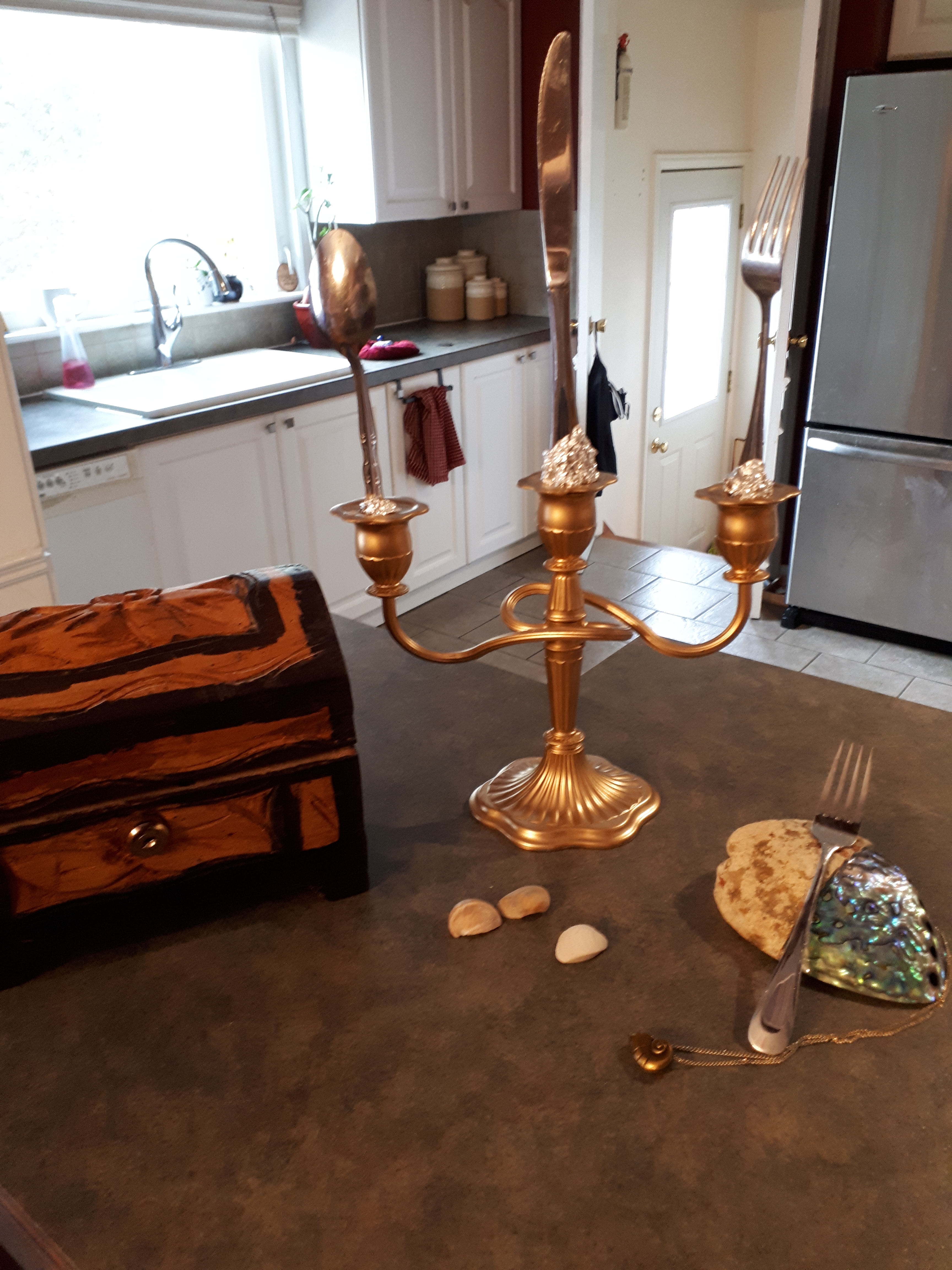 This is the part where I walked around my house to see what I had that would suit a display. I found seashells, an authentic Ariel necklace, a fork, a treasure box and a candelabra into which I shoved cutlery, secured with tin foil. You may recognize the candelabra from the Beauty and the Beast portion of my Disney Princess Party. To see other “Walk Through My House” displays check out my Chinese New Year, Harry Potter and Cowboy Parties.