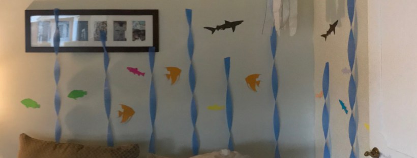 I got this idea from For the Love of Character. In the picture I saw on Pinterest the streamers were green, to be seaweed. But I checked multiple stores and could. not. find. green. streamers. So I used blue. I think it still looks oceanic. Then I used my Cricut to cut out multi-coloured fish and sharks. I taped it all to the wall. Actually, my son and I did the streamers and the girls did the fish. Shocking that the kids are actually helpful in decorating now.