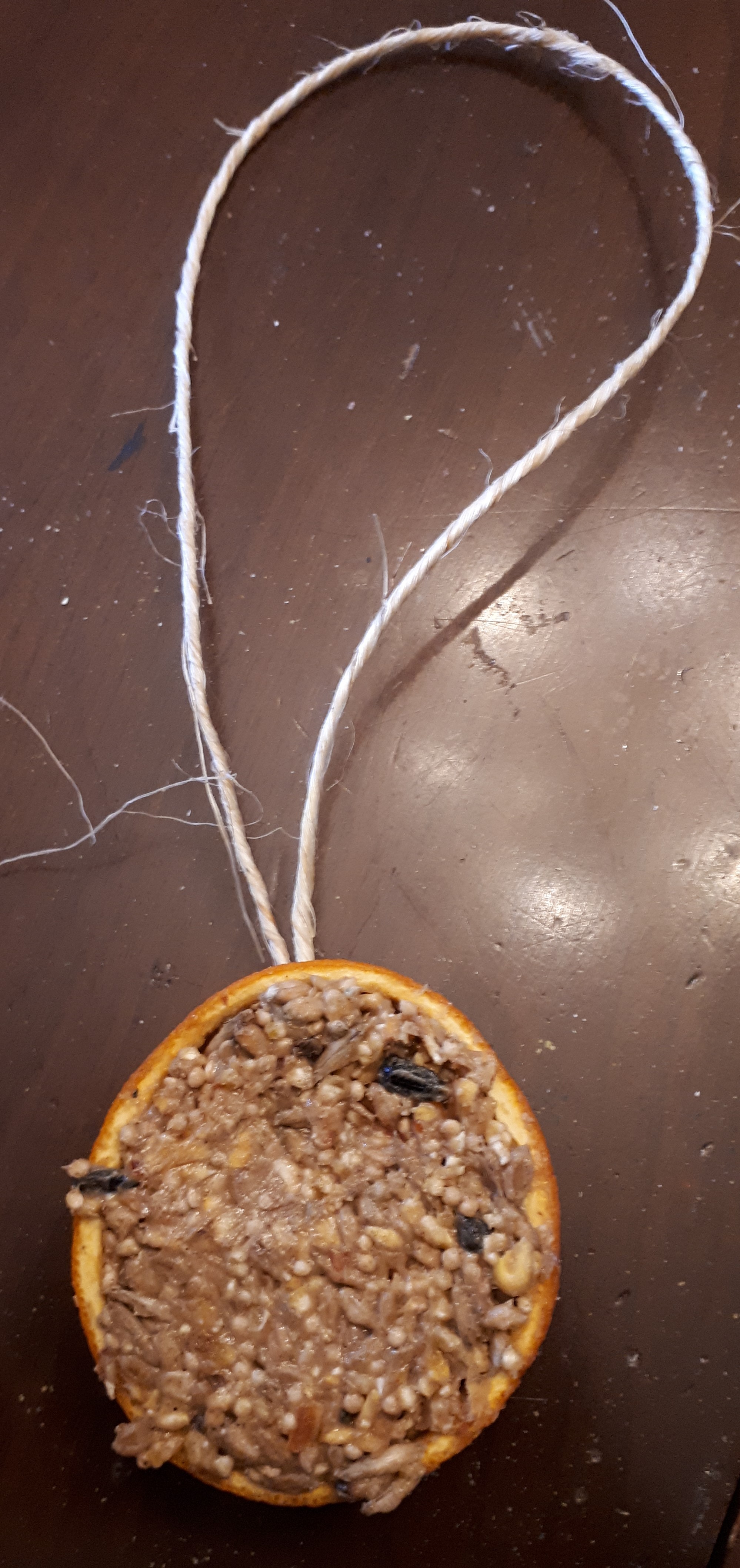 - orange (apparently you can use any fruit. I liked the idea of an orange because the peel is nice and sturdy to hold up the twine)