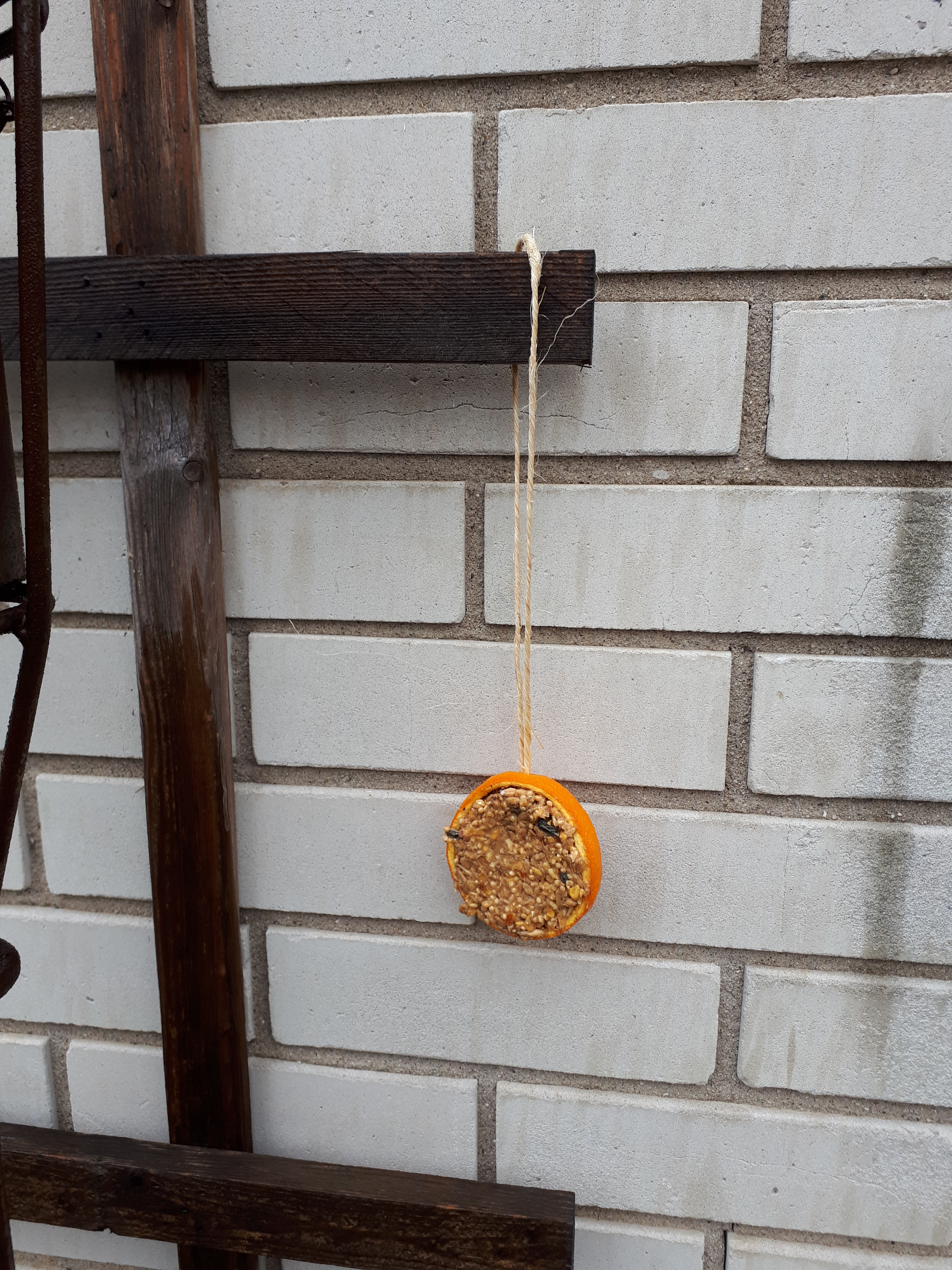 It’s Spring! Finally! Don’t you love to hear the sound of all those birds!? I always forget just how much chirping there is! Although I hear birds a lot, we rarely see them in our backyard. I thought it would be lovely this year if we could get a few more birds around here, and what better way to try to attract them than with bird feeders. I did some research and read that birds like to eat fruit, and that one of the best times to feed them is in the early spring! This is because they don’t have their natural seeds. You can check out that information at The Humane Society. I also remembered from elementary school that birds like peanut butter. I confirmed it at The Spruce. There are two things that I really like these bird feeders. 1. That they cost very little money and 2. most of the supplies were on hand. We were eating oranges anyway and we always have peanut butter on hand. So, the only cost was the birdseed, which was less than $4. Plus, you don’t have to store these all winter, or hope they weather the snow!
