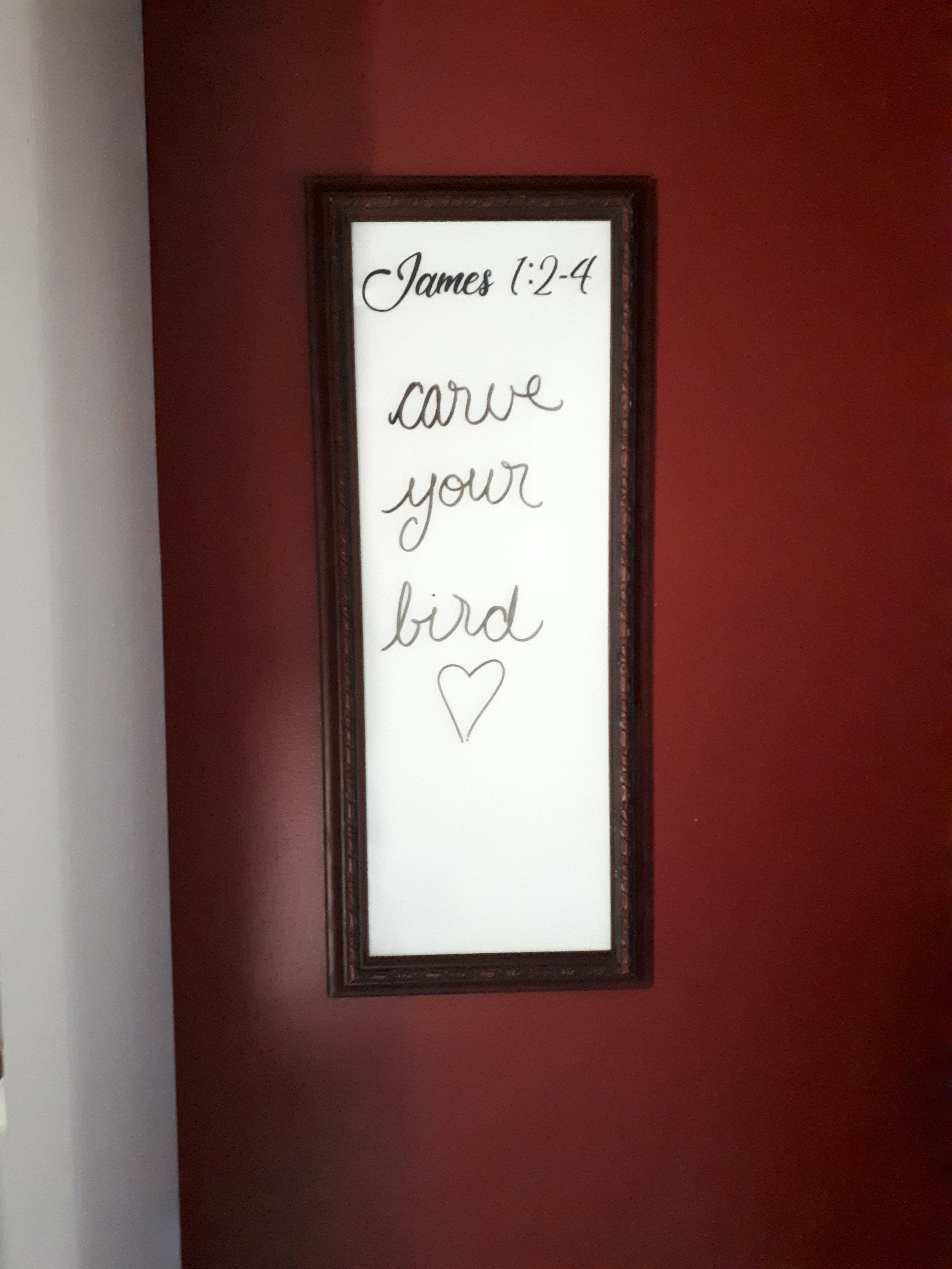 7. Hang it up and write on it! The night I finished my sign I began reading “Teaching from Rest” by Sarah McKenzie (she’s also the author of The Read Aloud Family). In it I read the story of a craftsman working on a cathedral. He was carving an ornate bird into the wood of the cathedral. Someone walked by and said, “Why are you carving that bird? It will be in the wall. Nobody will even see it!” And the craftsman replied, “God will see it.” So I wrote “Carve your bird” on my board to remind me that even though no one will see what I do with my kids, and my kids won’t even appreciate it until much later, God is still seeing all the effort I’m putting in; all the potty training failures I’m cleaning, all the lessons I’m teaching, and all the cleaning. All. The. Cleaning! It’s helpful to look at my beautiful sign and remember why I’m doing all of this. And because it’s a dry erase board I can change it all the time. I can use it for encouragement or for practical purposes.