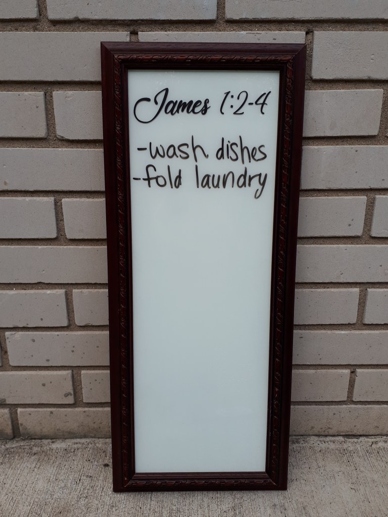 I’ve mentioned before that we’re homeschooling. This is our first year and I love it, but it definitely comes with its challenges. There’s no shortage of ways to fill my time: cleaning, laundry, cooking, cleaning, teaching, reading, cleaning, snuggling, preparing, cleaning and on and on. Sometimes it gets overwhelming. Sometimes I just have trouble remembering what on Earth I’m supposed to be doing – or telling my kids to do. For example: I often fold laundry during quiet time while drinking tea and listening to audiobooks (my absolute favourite is Harry Potter! I’ll put the links for my favourite version of the audiobooks at bottom of this post for if you want to find them on Amazon. I just LOVE them. They’re so well read!). Then I set the kids’ laundry at the end of their beds…and forget about it until I’m putting them to bed. I thought that if I had a sign in my kitchen where I could write things like, “kids put away laundry” then I wouldn’t be shocked when, at the tired end of the day, I remember that their laundry needs to be put away. So I created this gloriously helpful and encouraging (and beautiful!) Picture Frame White Board. My Dad gave me the frame when my parents redecorated their living room, and I had no idea what I was going to do with it, but it was just what I needed! Let’s get crafting and you can tell me what you think!