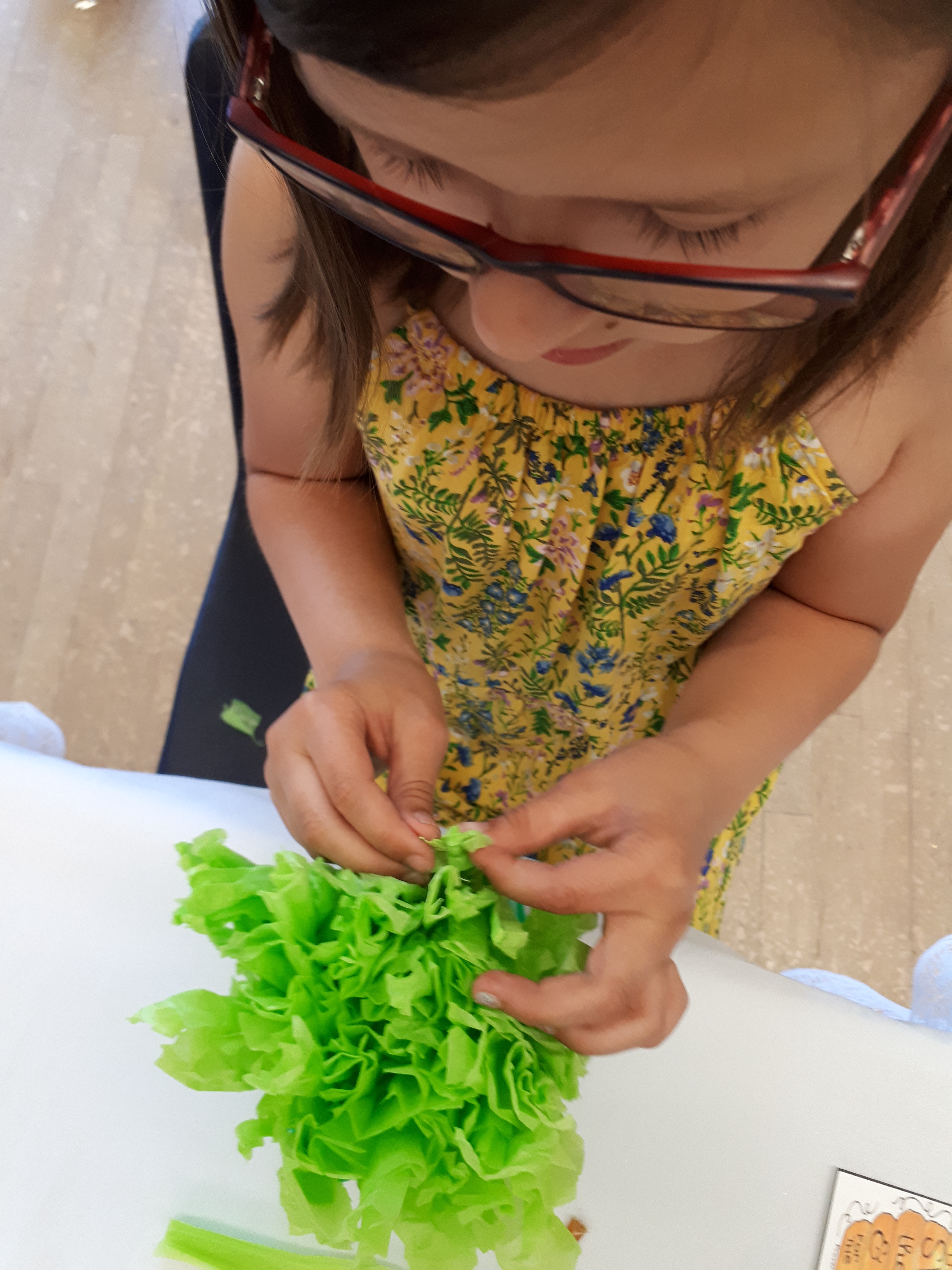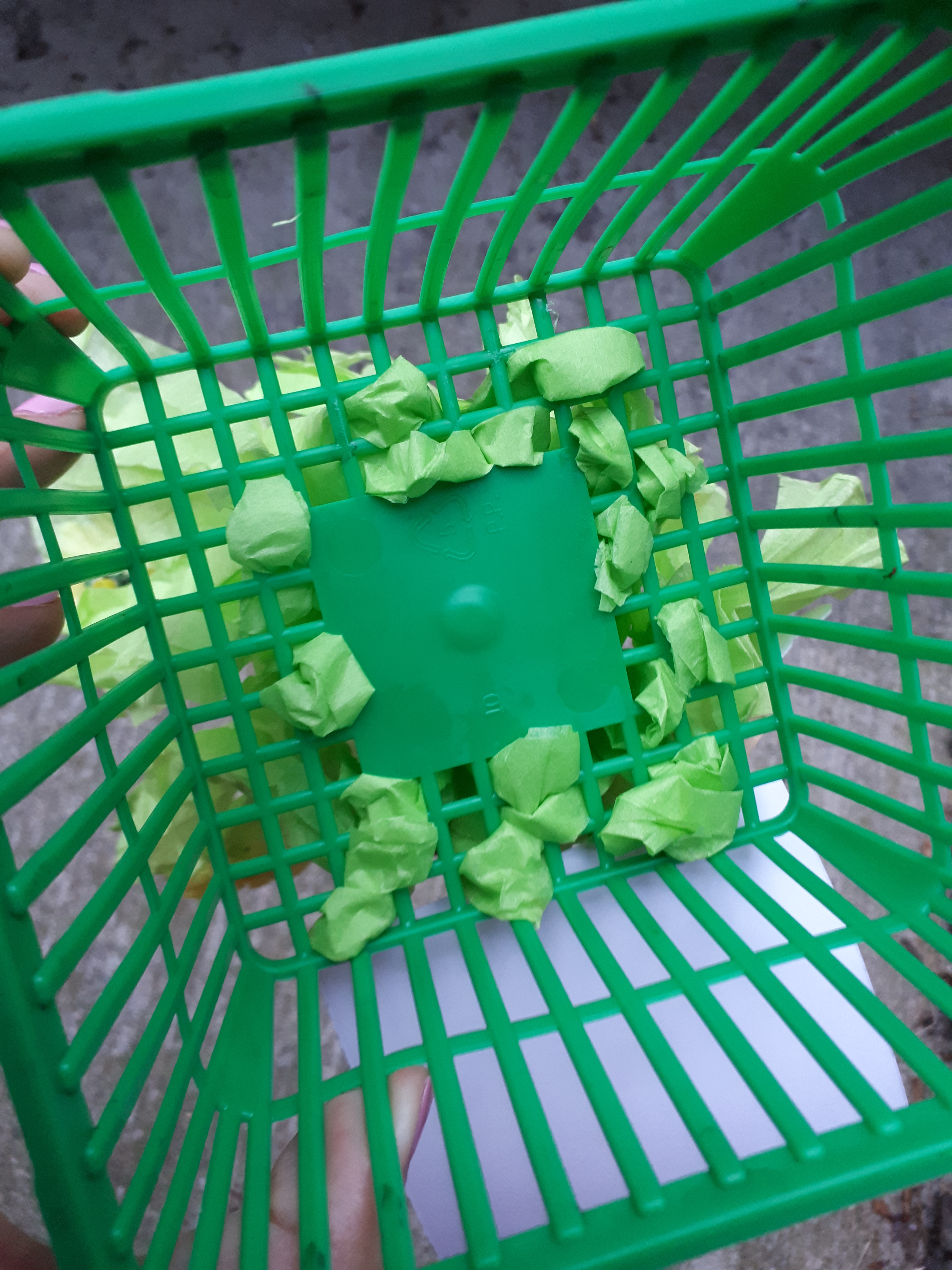 - Roll up your green tissue paper (two pieces at a time) and thread it through the holes. I think it’s easiest to start in the centre and work your way out. If you use only one piece of tissue paper your “grass” will just flop over. If you use more they will be harder to unroll (see the next step), so I wouldn’t try more than four pieces.