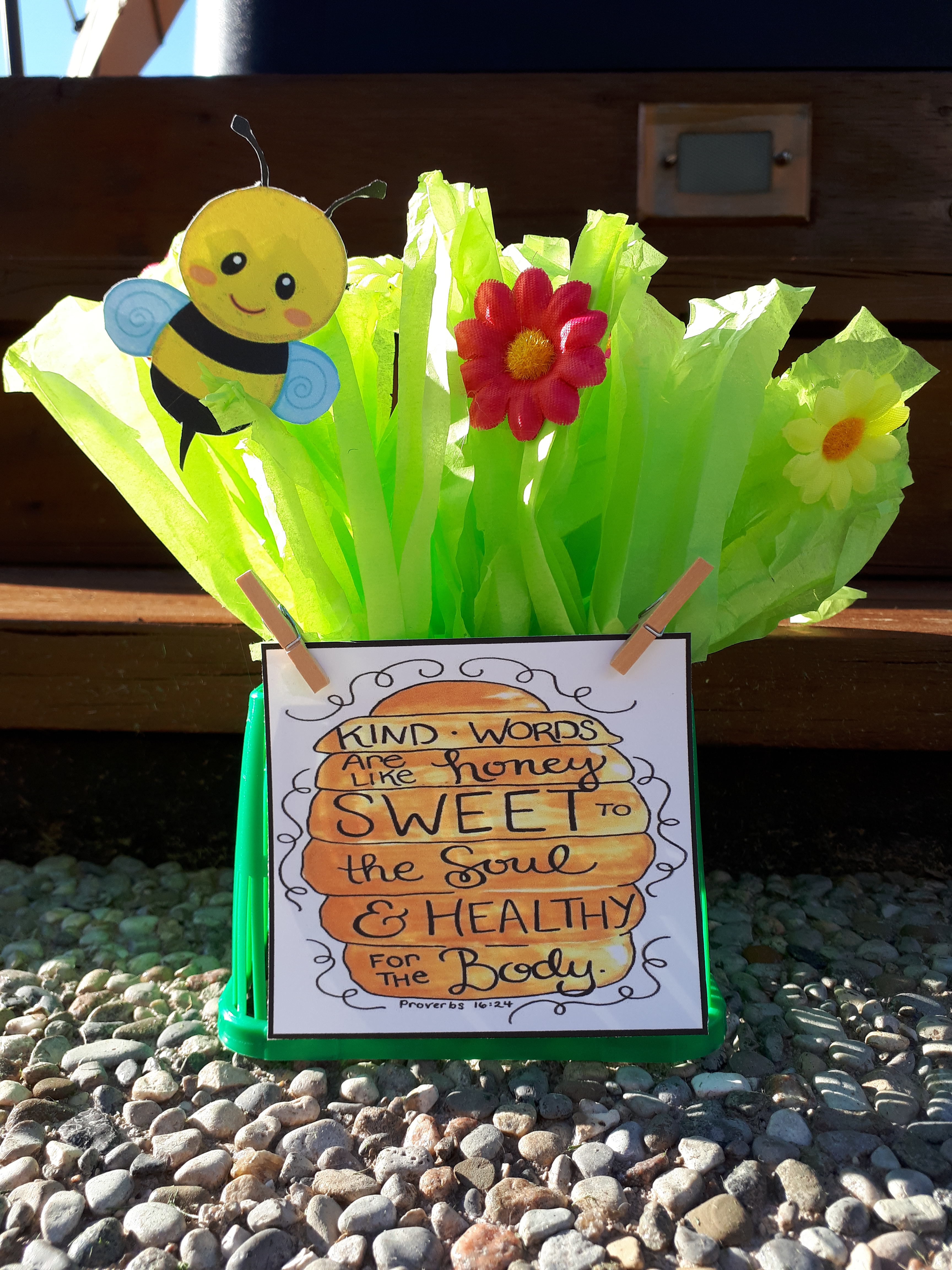 4. Use your itty bitty clothes pins to clip your verse to the basket or the grass. We got our verse from Jamie Loves Letters who you can find on Etsy. I just thought it was the perfect little picture. The words are easy for beginner readers to read, it’s simple but really sweet (pun intended). Jamie has several beautiful water colours you can purchase. If you’d like to check out Jamie’s Etsy shop just click here.