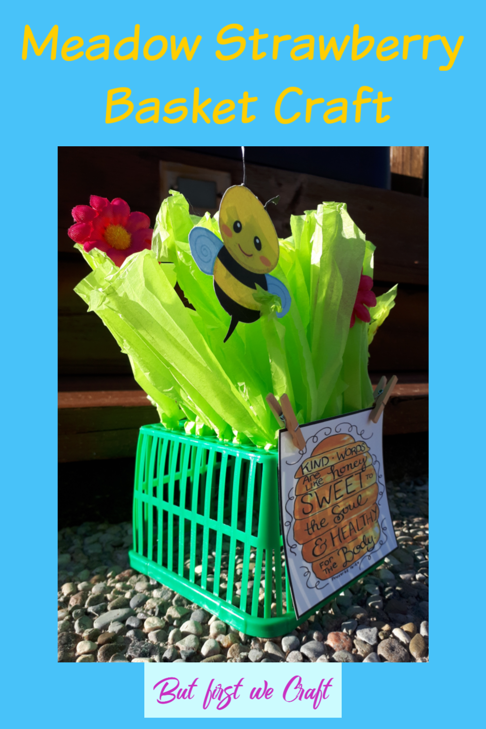 It’s the start of summer and that means it’s strawberry season! Strawberry shortcake, strawberry tarts, chocolate covered strawberries…mmmmm… On Saturday I went with my parents to their local farmers market and we got four flats of strawberries to turn into strawberry jam. Coincidentally, my Mum was planning a little party for her Sunday School class the next day and she asked for my help. The theme was honey and bees, focusing on verse 24 in Proverbs 16 “Kind words are like honey – sweet to the soul and healthy for the body.” So for the craft we decided to use some of those myriad strawberry baskets and make a craft out of them: a little meadow of grass and flowers for the bees to collect their pollen. The party was really lovely, and I’ll give you the details on it in a couple of weeks, but for now here are some things we did to whet your appetite: fresh buns with honey, a Bible story where two characters speak kind words (any guesses which story?), some Bee-autiful decorations and more! But for now, I hope you’ll save your little baskets and make this craft!