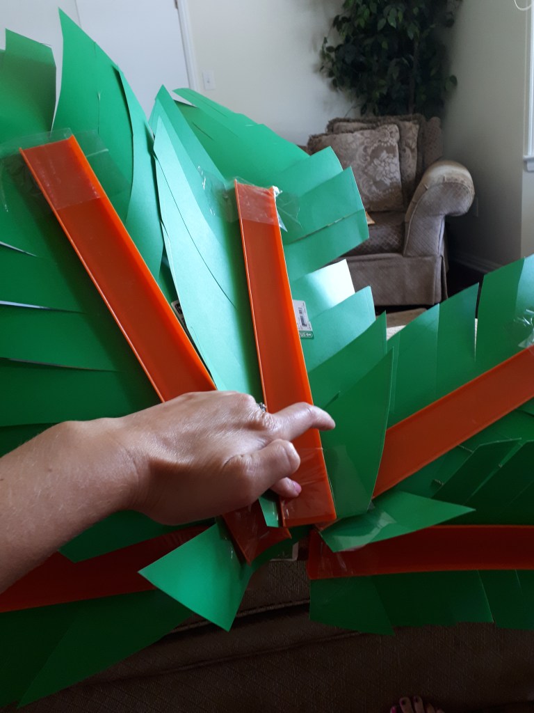 2. Cut the leaves so they look like palm fronds. I found that the easiest way to do this is to cut a diamond shape at the tip of the leaf and then follow those angles all the way along the leaf. Leave about an inch uncut down the centre of your leaf.
