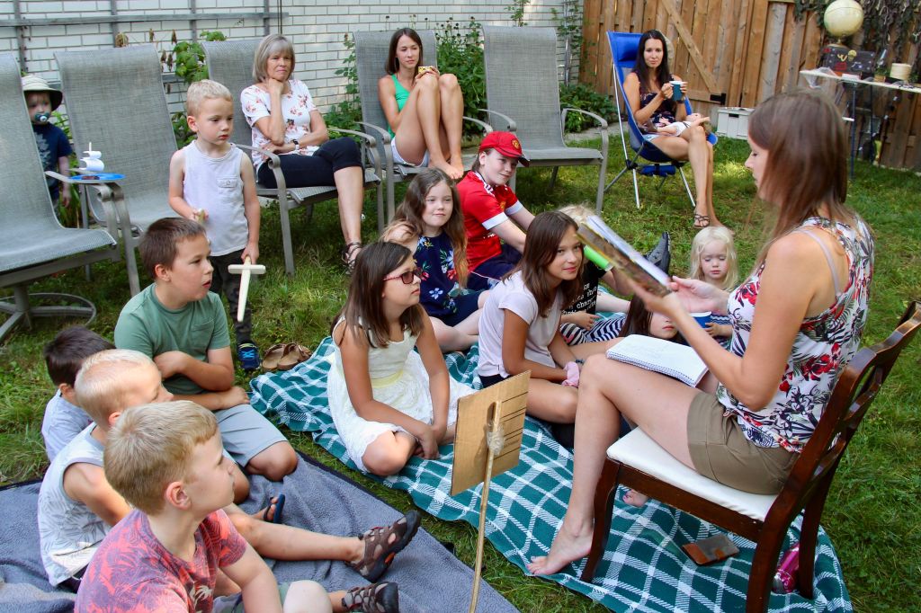 We laid out two blankets for the kids to sit on with a row of chairs for the adults to sit on behind them. Then I had a chair to sit on at the front. We would start every activity by reading the corresponding pages in the book. It was just awesome how everyone sat so quietly to listen to a book at a birthday party. I loved it!