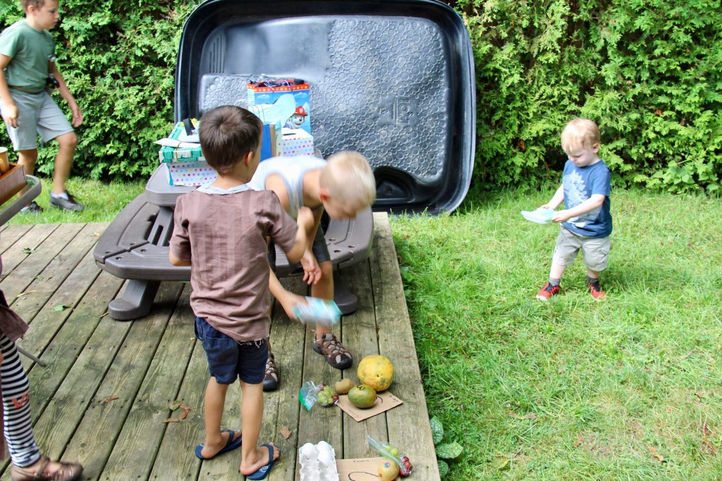 In the book, Robinson Crusoe has to find his own food. He says specifically fruit and eggs, and he learns to harvest grain and make bread. So I thought that we should hide fruit, eggs and bannock mix for the kids to find. I also threw in seaweed because my son loves seaweed and he was the birthday boy. Each item needs a number on it corresponding to the team who should find it.