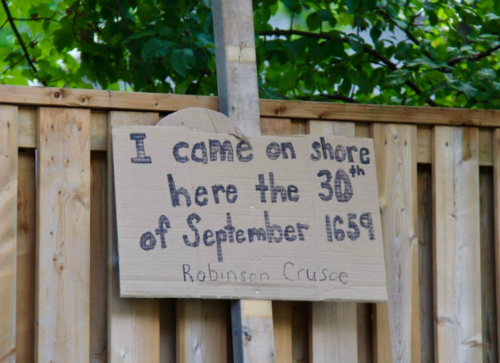 I didn’t add this under decorations because I only turned it around when we read this part of the story. In the book, Robinson makes a sign on which to carve the number of days he’s been on the island in order to help him keep track. He carved the above words into the sign. I had another small sheet of cardboard and a permanent marker so each child could sign the cardboard and then we stapled it underneath Robinson’s name.