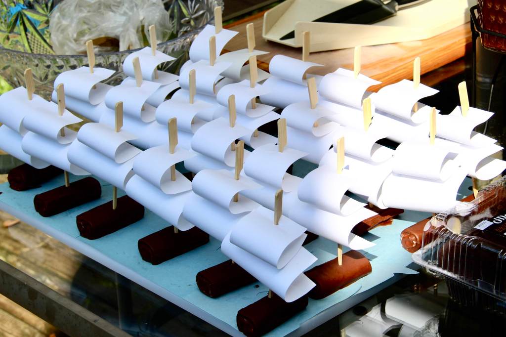 My niece made this little armada. Isn’t it sweet (pun intended)? And we broke out the three drink dispenser: 1. water with lemon and lime slices, 2. Iced tea with lemon slices and 3. lemonade with lemon and strawberry slices. (Party tip: have a permanent marker for guests to write their names on their cups. That way you won’t go through as many. Now that I’m thinking about it, maybe we should be doing that for plates too. The little kids eat a couple bites, wander away, and no one knows to whom each plate belongs).