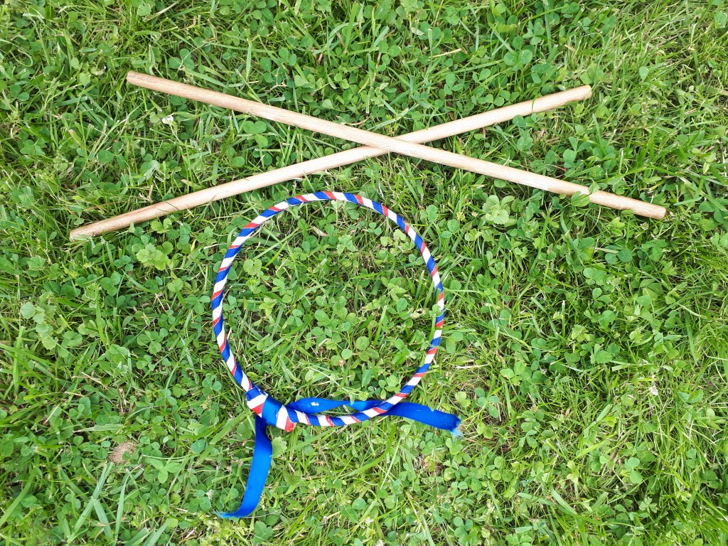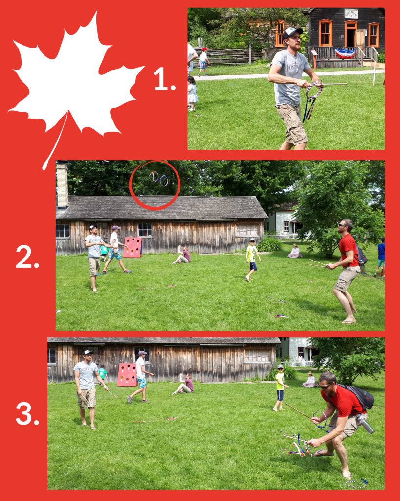 This summer for Canada Day some of my family headed out to our local pioneer village. We had a lovely time looking in all the old buildings, sitting through a turn-of-the-century school lesson and playing some of the old-fashioned lawn games they had sitting out on the green. One that we all loved was made up of hoops and sticks. You use the sticks to toss the hoop (detailed instructions – in just three easy steps! – are at the end). I have since learned that this game is called the Game of Graces because it was supposed to teach young ladies how to be more graceful. However, it got pretty competitive between the uncles when we played!