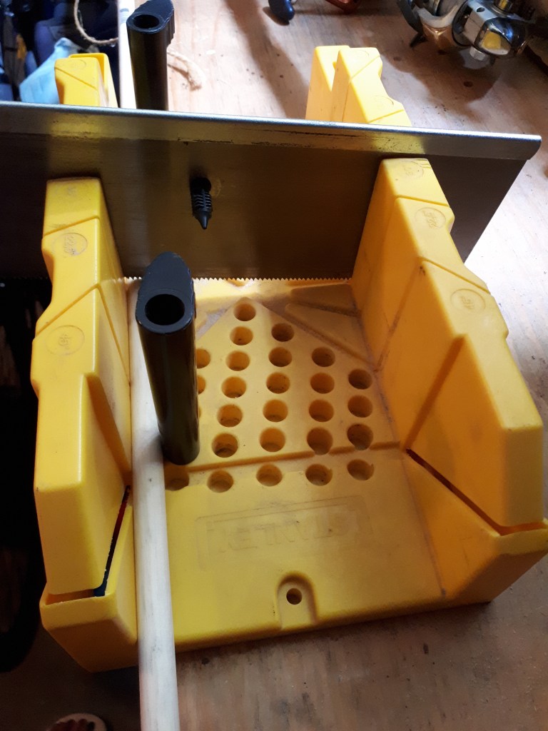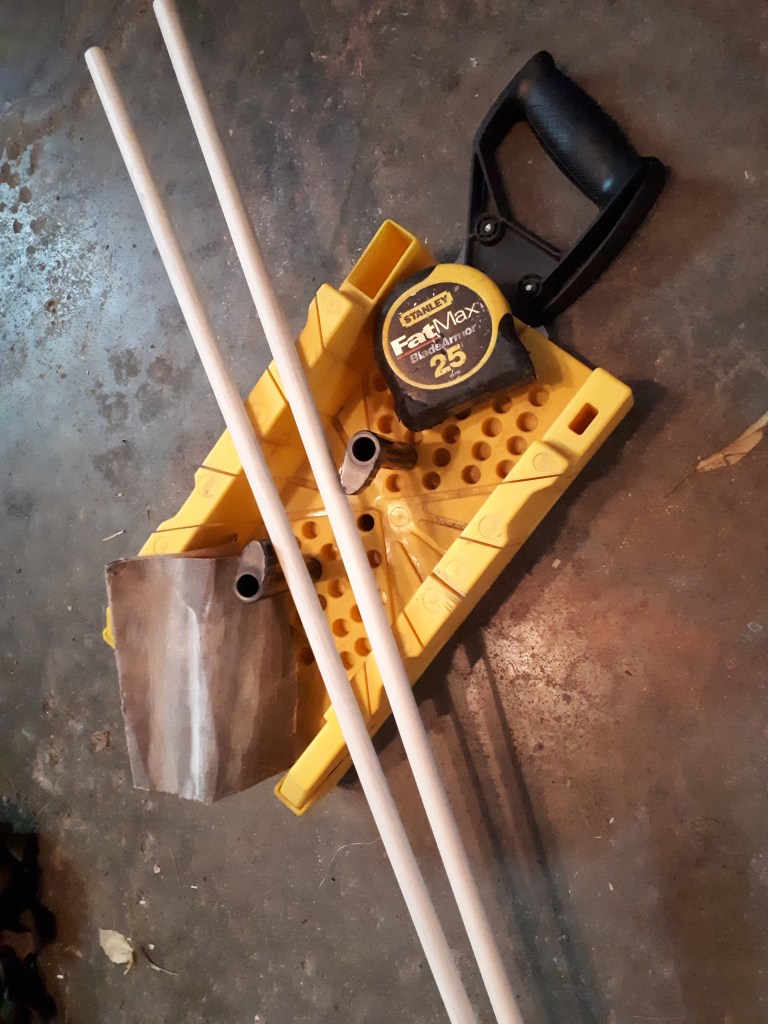 - My dowel came in 2 foot lengths. Since this would be too unwieldy for the game I had to cut it down. I thought 18 inches would be good, but a bit shorter would work too. I used a mitre box to cut my dowel, but you can probably use whatever sort of saw you’ve got. If you’ve never used a mitre box before you’ll love it! It’s so easy to measure and line stuff up. Such an awesome way to saw.
