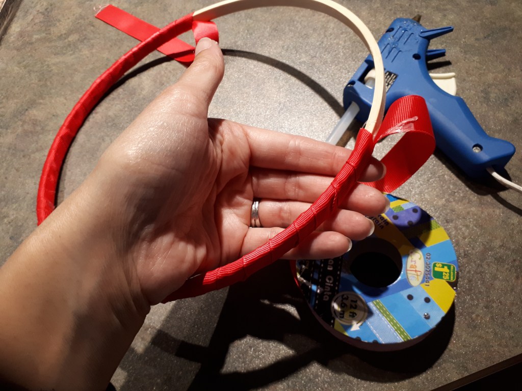 2. Continue wrapping the ribbon diagonally around your hoop, thoroughly gluing it down as you go.