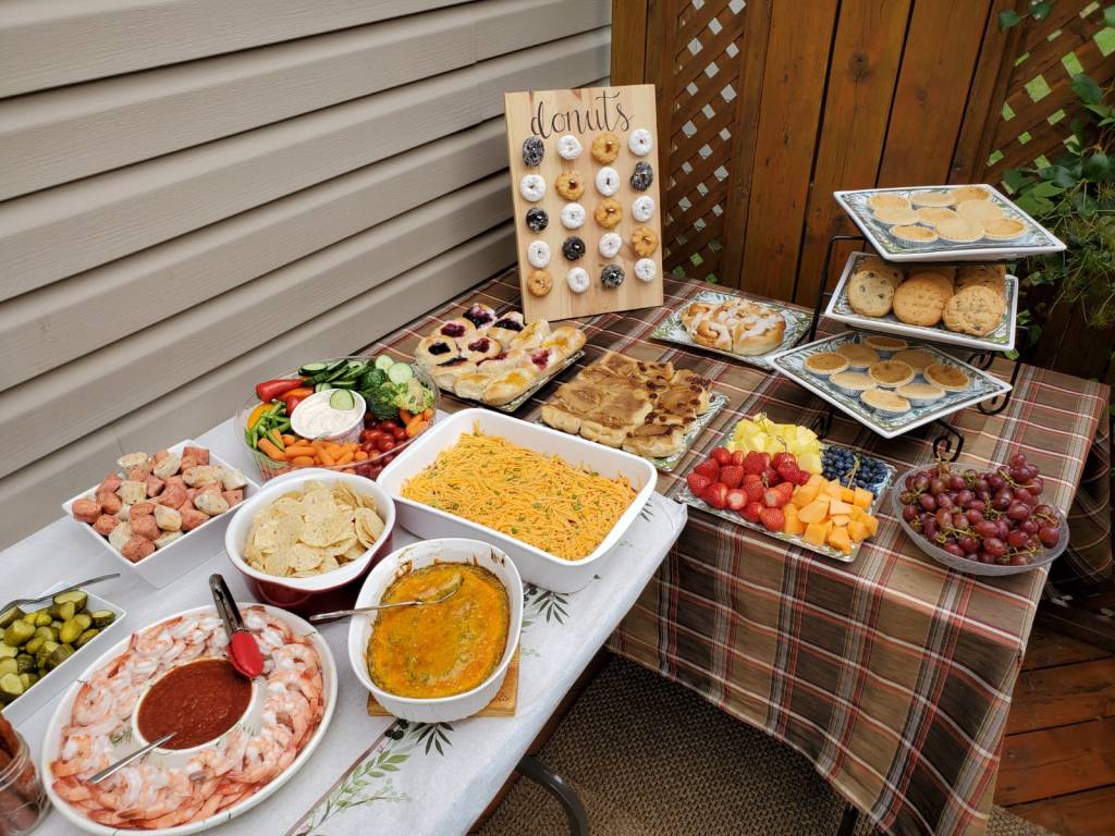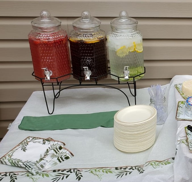 For drinks we kept the tea flowing and just left out the Keurig, cream and sugar for guests to help themselves. We had insulated paper cups with a permanent marker so people could write their names on them. There was one juice dispenser of white grape juice and ginger ale with green grapes in it on this table, and a 3 jug dispenser beside it.