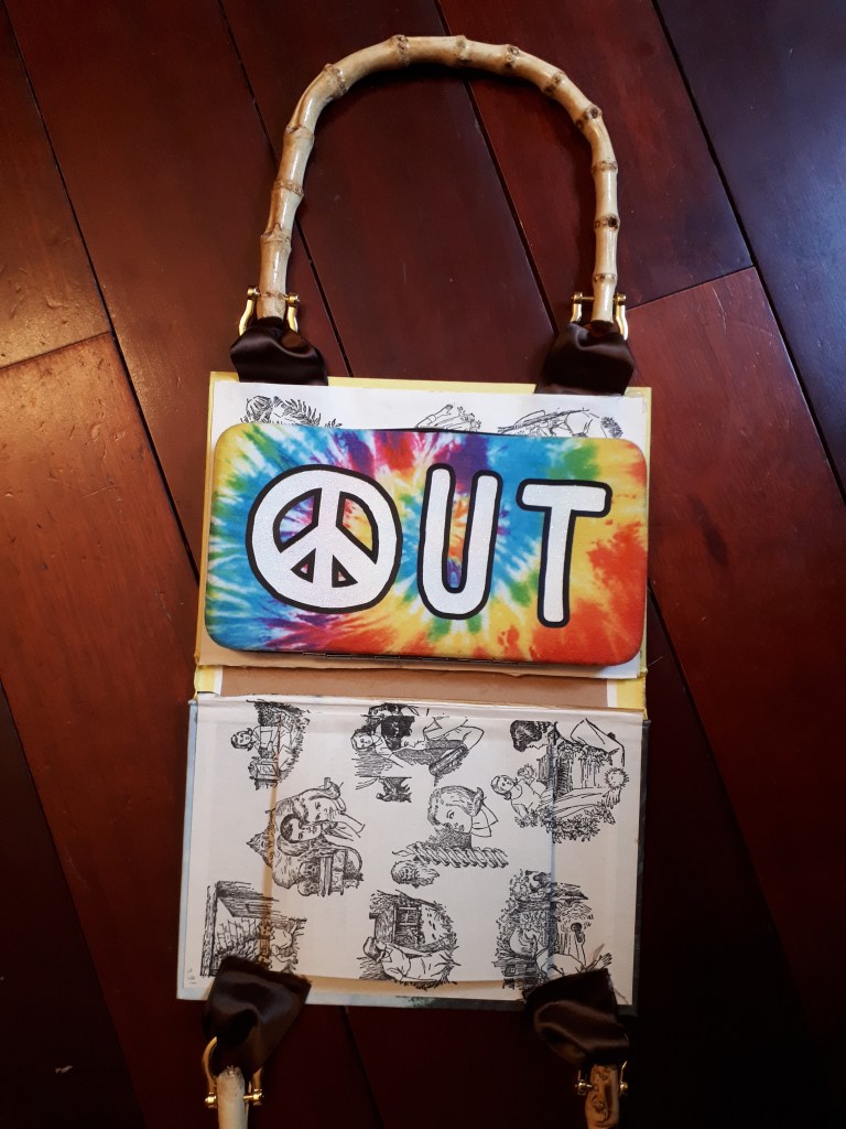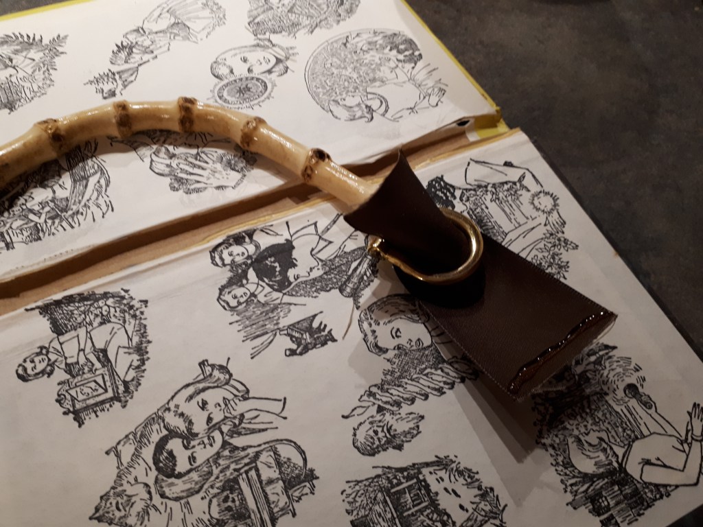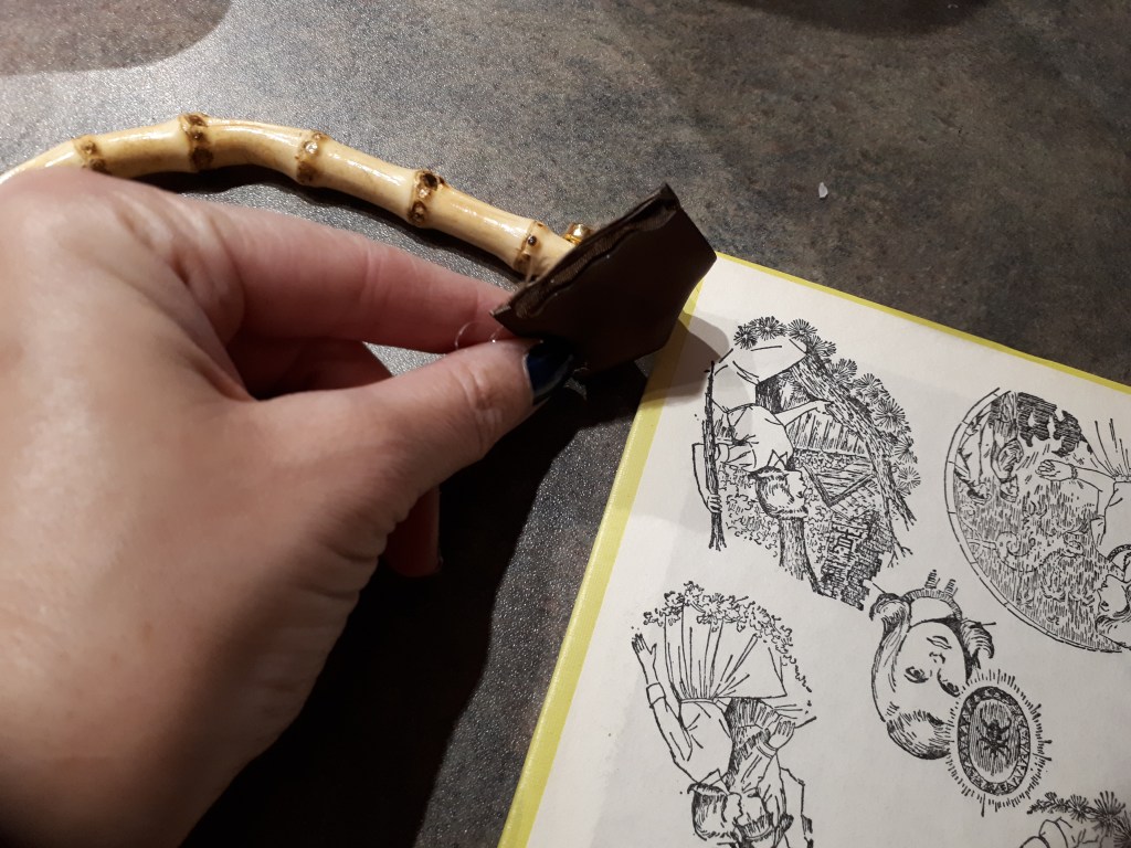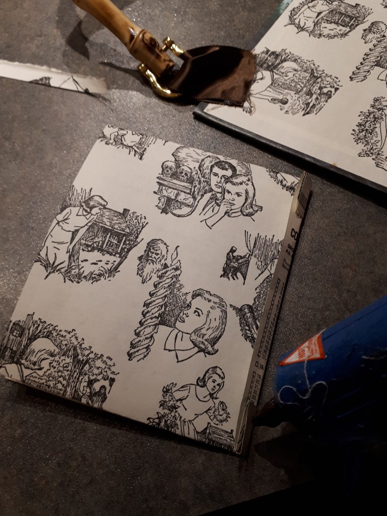 We went to a Medieval Fair this summer and there was a woman there selling purses made of hardcover books. I told the woman how wonderful I thought they were (I regret that I didn’t take note of what her name, or her shop’s name was). Her main medium was making woodland hairbands, you know, the ones with unicorn horns or deer’s ears. It was a lovely little stall. Anyway, she told me the hardest part of the purse for her was finding hardcover books with the pretty covers; so many of them just have the title and author. For me, the hard part was finding the purse handles. I have so much more detail on that later.