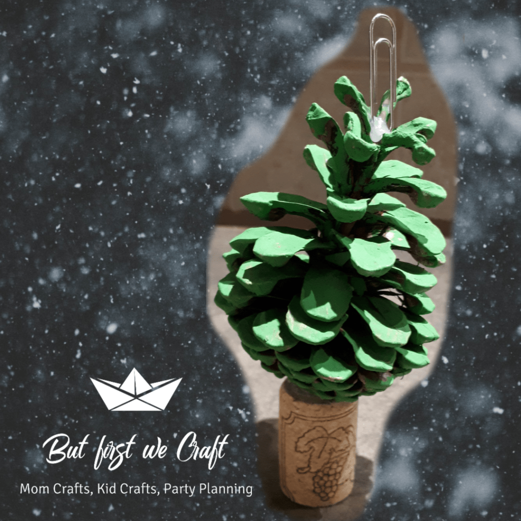 These were such a blast to make! I went on a walk with my kids and challenged them with finding the 7 most Christmas tree-like pine cones they could find. We let them dry out for a few weeks (we collected them in the rainy fall) and then we all painted them green…I may have done a few touch ups! After letting them dry I glued a wine cork on the bottom (cutting off the bottom end so they would stand up straight) and a paper clip on the top.