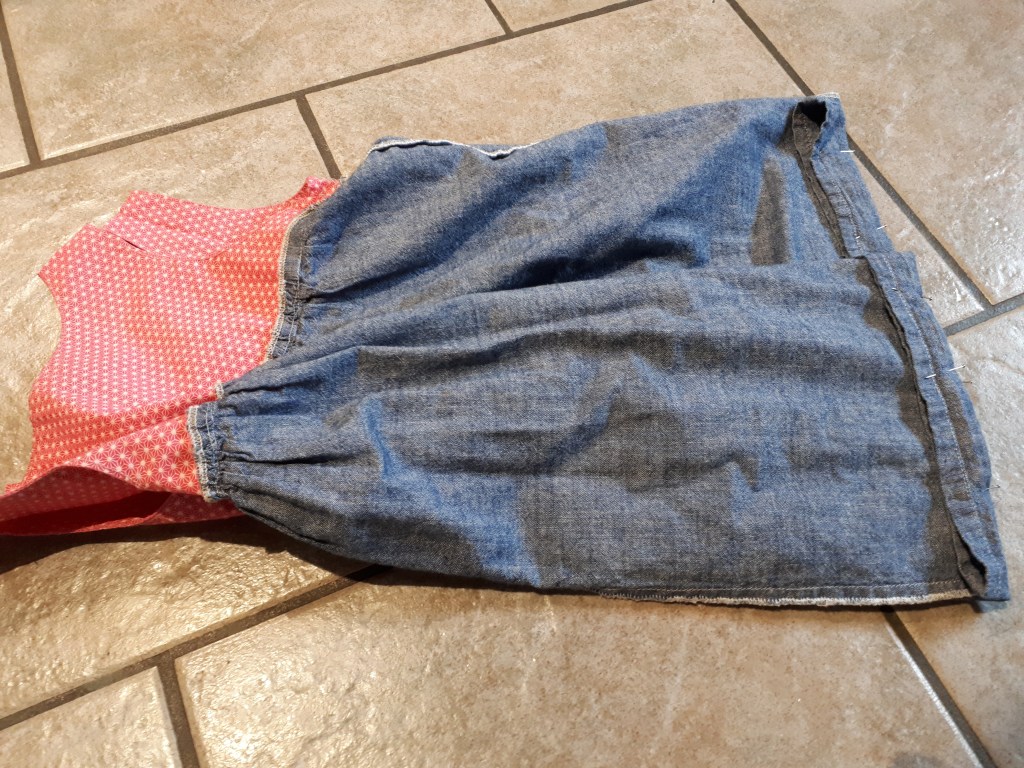 The size of dress I used is about 2T (it’s homemade, so there’s no size on it). When choosing which dress you’ll make into a bag you want to give some thought to what size you want. Making a bag out of an infant dress is only practical if you know what kind of thing you are going to put in it. Maybe an infant sized dress will make a perfect purse for a toddler aged girl. But if you want it to hold clothes or books you’ll need it to be more like 2T. Before you start making the tote try putting some things inside the dress to see if it’s a good size. Remember that when we hem the bottom you’ll lose some space, but we won’t do anything to the sides, so that measurement won’t change. I don’t have pictures for every step, but the steps without pictures should be super easy to understand!