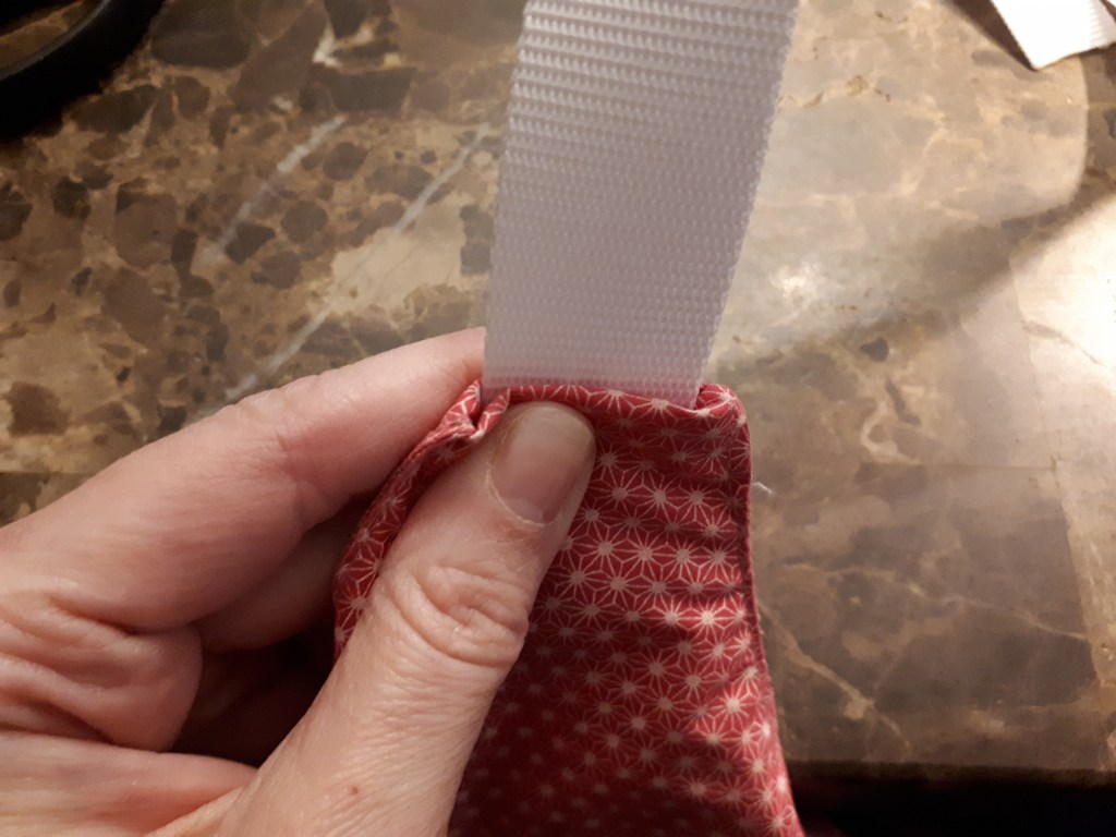 5. Fold in the raw edge of the dress strap so it creates a hem. Insert each end of the webbing into the holes of the strap. One webbing goes into each opposite strap so the bag opens more easily, i.e. one webbing will go into the the straps on the front of the dress, and one webbing will go into the straps on the back of the dress.