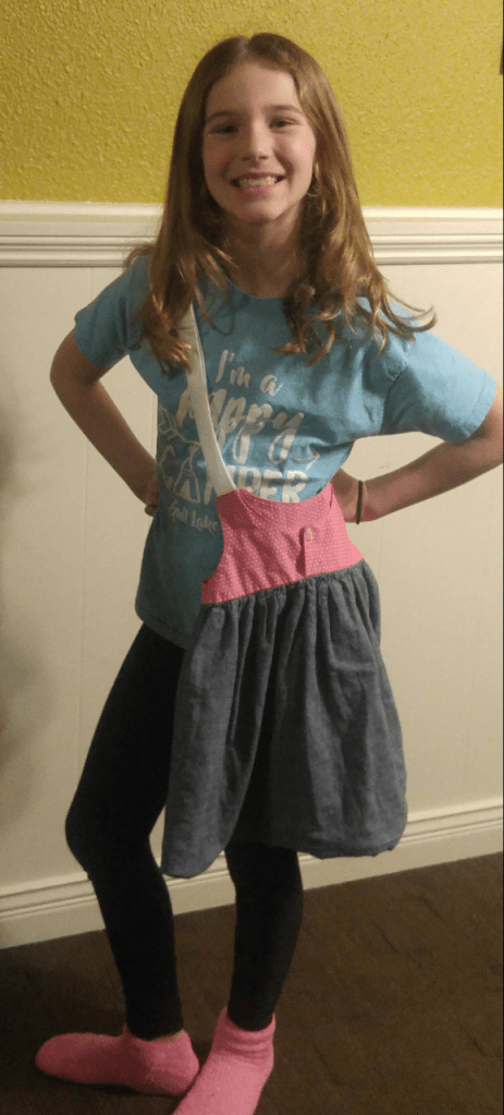 One of my friends has three daughters, and her youngest is a year older than my oldest daughter. She often brings us bags of hand-me-downs. One thing this family is known for is the adorable and/or beautiful dresses they have. They have a set of matching dresses, of which the youngest has worn all three. My daughters are done with one of them now, too, so I’m going to make my friend a tote bag out of it!
