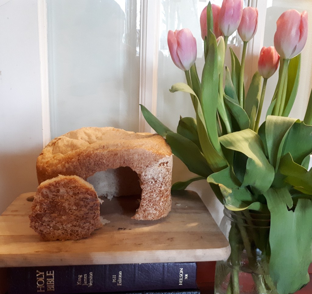 11. Make Resurrection Bread. I thought of this while my family was sitting around the table having lunch. When I said it my husband laughed, right out loud. I thought he was making fun of me, but he said that he thought it was a great idea. For the next few days after I made it he said multiple times how much he liked it, and that it was his favourite of all the decorations I made😏💗. This is how I did it…I guess it’s pretty obvious, but here it is anyway. I made bread in my bread maker, cut off the bottom of it and pulled out all the fluffy and delicious insides (and ate it with soup – Mmmm). Then I cut a circle out of one of the sides of the bread, rolled it away (get it?) and placed it to the side of the hole. Super easy, but so lovely! We displayed our Resurrection Bread on our table, beside our tulips, from the Tuesday before Easter until Easter Monday. The kids kept asking if they could eat it yet, and occasionally I’d see them trying to sneak a bit…gross.