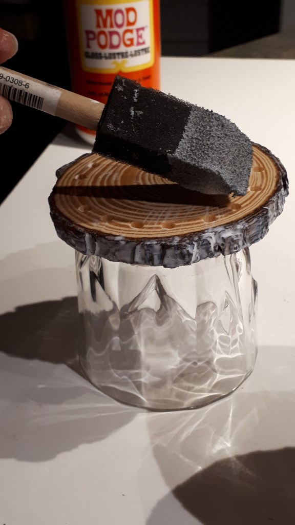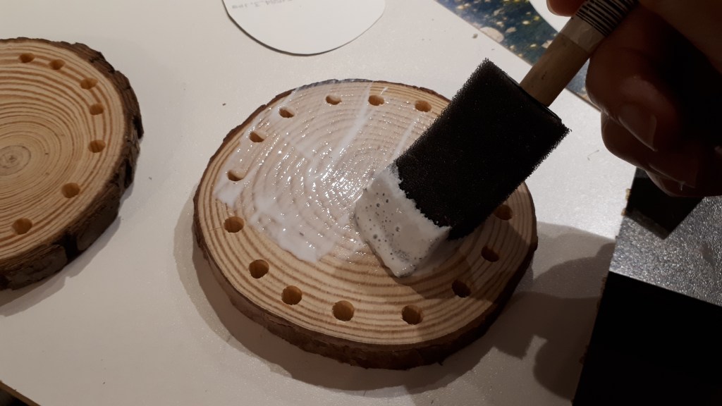 4. Flip over the wooden cookies and Mod Podge the sides and the back. To prevent the Mod Podge on the sides from sticking to the table surface, place the slice on a cup, or something similar. A toilet paper roll would work well. Allow the Mod Podge to dry again.