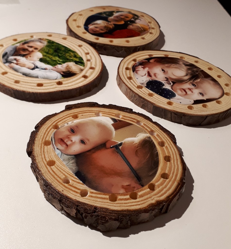 2. After cutting the photograph to fit in the space, Mod Podge the wooden cookie. This will help the picture stick to the wood slice. You can Mod Podge right over the holes. To prevent the holes from getting clogged, just blow through them when you’re done brushing.