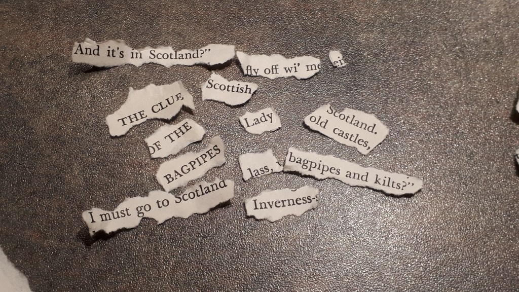 2. Rip up or cut the paper you want to use. I made this Repurposed Lip Balm Container for my very dear friend Janet (our free printable colouring page artist!). She is from Scotland, so I ripped up Scottish words and phrases from my Nancy Drew “Case of the Whistling Bagpipes” pages. You may recognize these as the pages I took out of the DIY No-Sew Hardcover Book Purse. I also ripped up some blank or random paper to put as the background and bottom of the container.