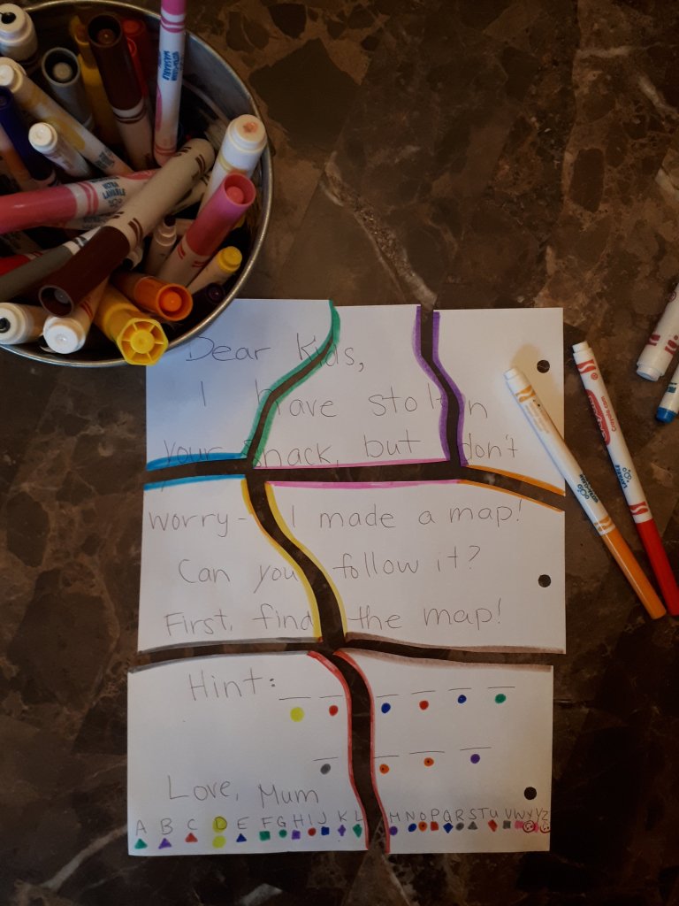 My husband gave them the letter, which led them to their bathroom where they found the code in the bathroom cupboard (note the different coloured shapes as the code. This worked extremely well). The code led them to the living room where they found the map in the cedar chest. And the map (eventually) led them to three points in the basement where the found cheese strings, applesauce and Oreos.