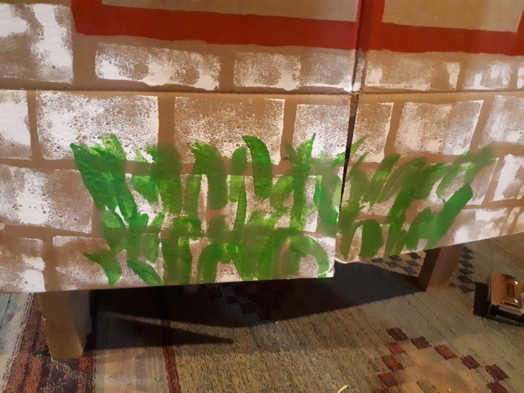 To do the brick work I just dipped a rectangular sponge in white paint and put it in rows on the house, being sure to offset each row.