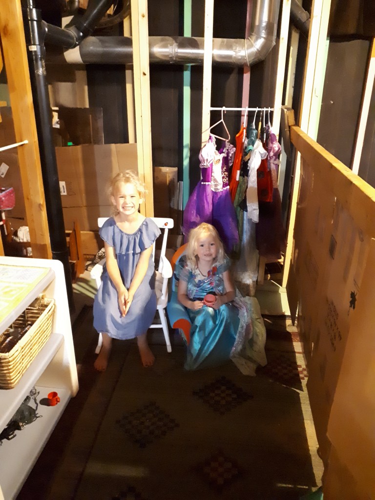 The picture above is of the living room, behind you can kind of see that there is a little bedroom with a very small bed. You can see their dresses hanging up, too. I had two little curtain rods from the window beside my front door that I was getting rid of right after we made this house, so I took them and put them inside the framing of the basement and hung up the girls’ princess dresses on them. They were so excited about this little feature. It was adorable.