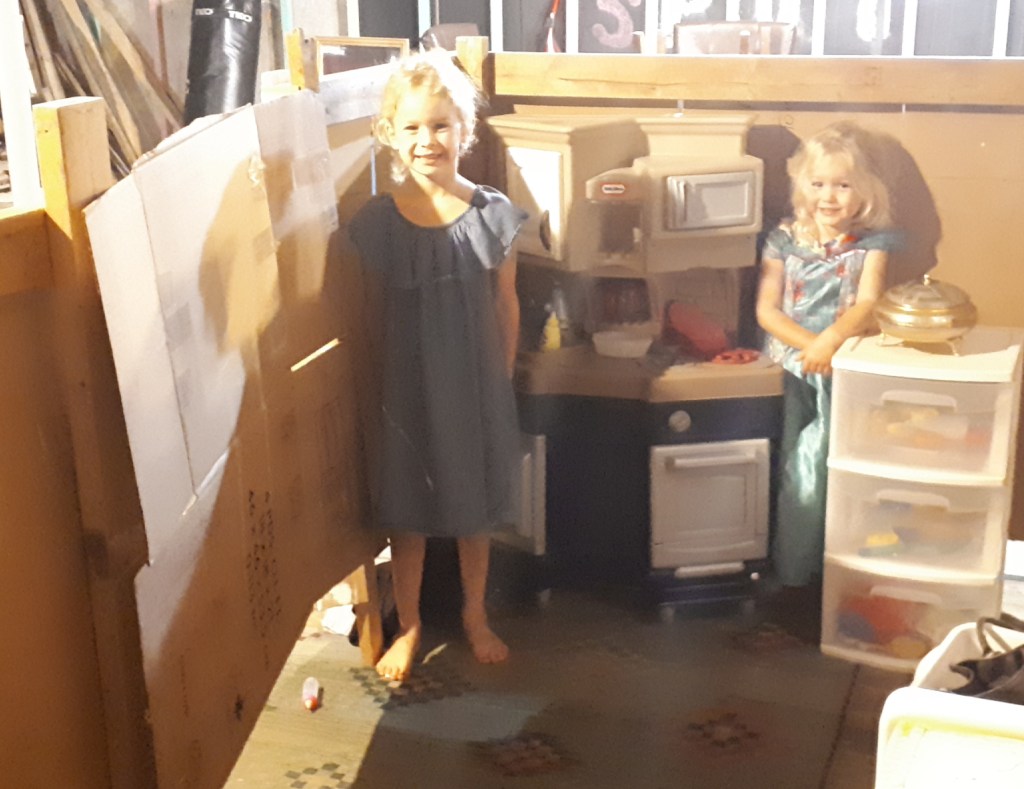 I made this on a total whim. My husband took the oldest two children fishing, and the little one wanted to play house with me. I was feeling rather tired, and not at all in the mood for imaginative play, so while playing I decided to try to convince my daughter that we ought to make a play house. She jumped right on board and helped me move a huge pile of wood in order to make the house in a corner with ample open framing. Our basement is an unfinished, wide-open monstrosity, which allows a lot of space for playing, but it’s also chaos. There are toy kitchen dishes and costumes all over the place all.of.the.time. So I thought that if I made a little house where they can keep it all, it may not continue it’s reign of terror on the rest of the basement (don’t ruin my dream…let me live in this little fantasy land for a spell!). So, after moving said wood, we got to building! Just the two of us💕. This house ended up fitting a kitchen, living room, and two very minuscule bedrooms!