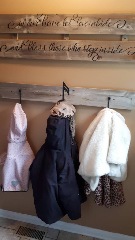 Another Covid Project my husband and I did together was to turn our back hall/laundry hall into a Mud Room. And guys, it looks SO GOOD!!!! I’m still waiting for my husband to build me a bench/shoe rack, and then I plan to show you the whole thing, but here’s a teaser😉. We used more fence board to mount coat hooks, and then hung this sign above it. Once again, fence board and permanent adhesive vinyl. I am almost out of fence board! How am I supposed to craft with no more fence board!?!?!?