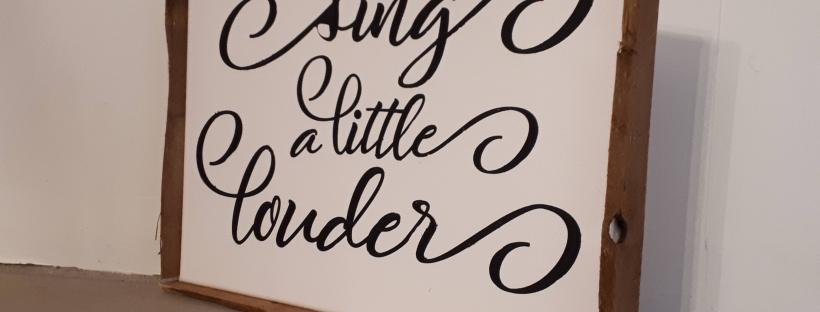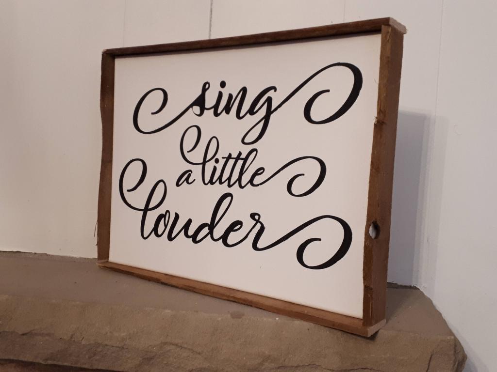 I made this “Sing a Little Louder” sign as a gift for a friend of mine who is going through a tough time. It’s a line from a song by Bethel Music called “Raise a Hallelujah” (there is an amazing story behind the song, which you can read here). My friend shared that this song has been an encouragement to her, so I thought she would appreciate having a sign of it. I made it on canvas with acrylic paint for the text. The frame is just salvaged wooden spacers from our fence board order.