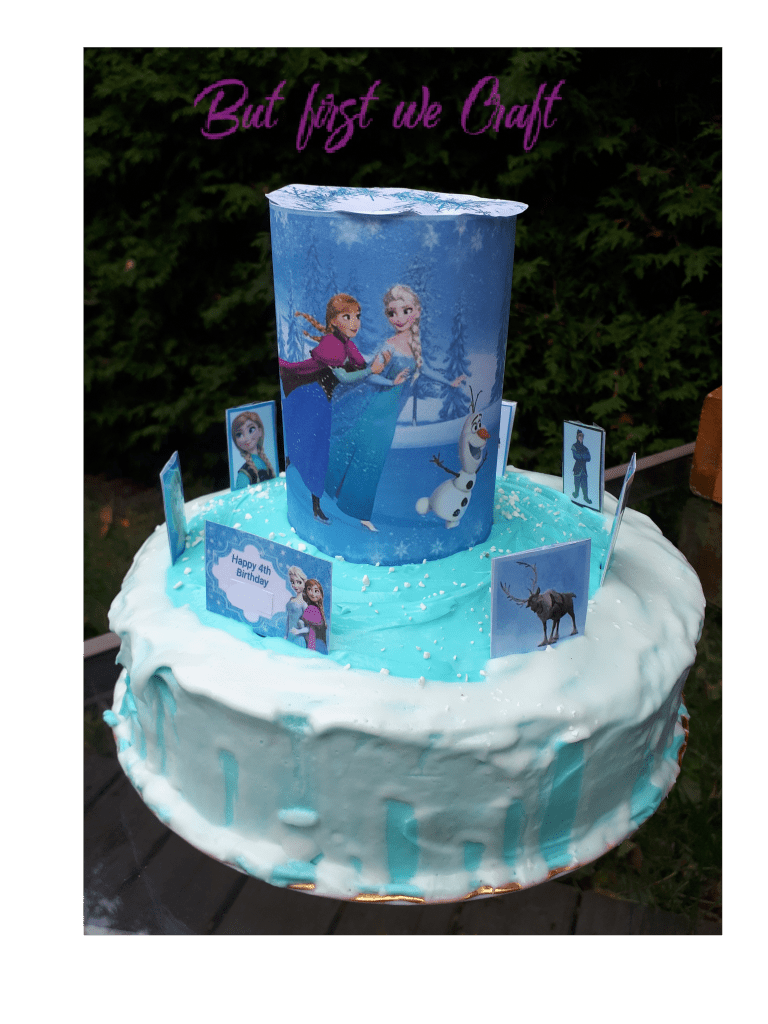 This DIY Frozen round cake was a team effort. The birthday girl and I made it, I iced it, and my Mum made the decorative cake toppers. I iced the cake with a tub of ready-made icing. I put into into a separate bowl and mixed in a couple drops of blue food colouring. Then, after icing the cake blue, I watered down some of the white coloured icing (which I left in the tub) and scooped it with a small spoon to drizzle the white icing along the edges to make it look like icicles and snow. To finish off the look we sprinkled the top blue icing with white sprinkles. These sprinkles were actually little teddy bears, so we crushed them with a rolling pin so they’d look like snow instead.
