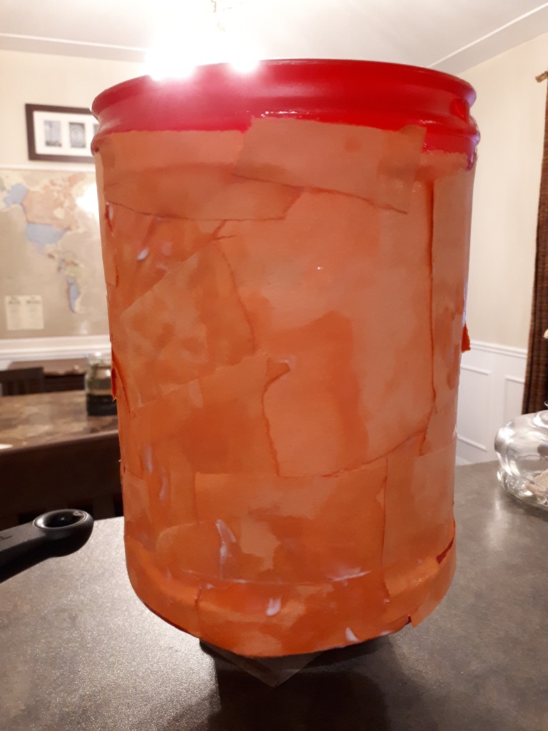 3. Continue doing this, overlapping at random, until the sides of the container is covered. You should wrap the edges at the top over the rim, or trim them with scissors so it’s even with the rim. Also make sure it goes around the edges of the bottom, but you don’t have to cover the entire bottom, just the edges. (Of course, my kids didn’t want to do this, so there’s a bit of red around the rim. The orange and red is rather hard on the eyes, but the kids don’t even notice it. And who’s the craft for? The children! Is it perfect? NO! Should it be? NO!!)