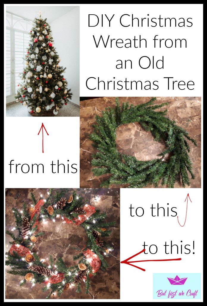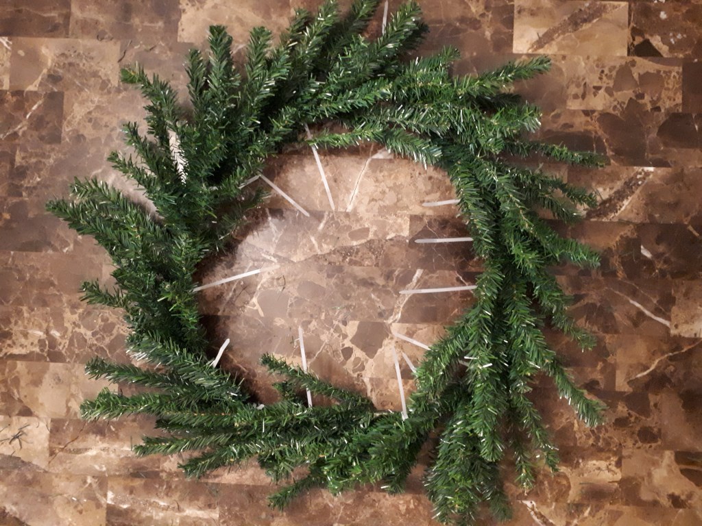 My husband and I got a new Christmas tree the first year we were married, that made it 14 years old this year. About five years ago my husband had to go through it and replace almost half of the lights. It took hours! So, this year, when we set up our tree and saw that, once again, half the lights were out we decided to get a new one. (Funny side story: After we decided to get a new tree my son shot the old tree, which was still set up and plugged in, with his Nerf gun. An additional third of the lights all of the sudden lit up!) We got a beauty of a tree, and had the old tree in the van, ready to go to Goodwill when I began having second thoughts: what if I want to make something from the old tree? I bet I could make a wreath out of it, or even a door hanging. So my husband took it out of the van again and hauled it down to my craft room – he’s a wonderful man💑!