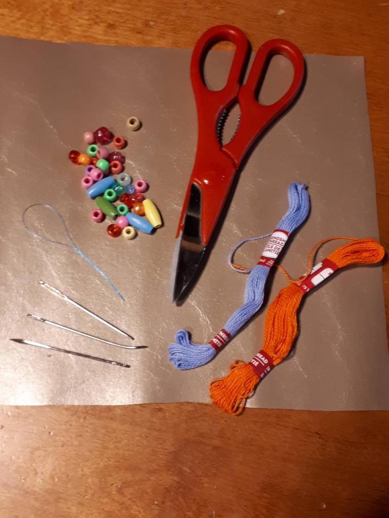 This is a great fine-motor craft, and lets children express their creativity through the colours of bead and embroidery thread they choose, whether or not they have tassels and whether they choose to wear it as a belt or a headband…or if they make both! This is also an awesome craft for little ones because they don’t need a real needle and thread to make it. They can use a floss threader, as we did with our Parfleche and Burlap Coasters. You will just have to thread it through for them using a real needle, then exchange it for a floss threader once the hole is made. Let’s check out how to make it!