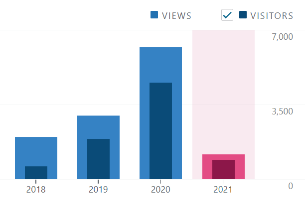 My stats are, in my opinion, excellent. They’re not major blogger excellent – you hear the stories of people getting more than a million views in their first year – it’s not like that. But I love to look at my stats and see the growth. For example, in the first year of my blog (2018, April to December) I got 604 visitors and 1981 views. In January alone of this year (2021) I got 888 visitors and 1161 views. That blows my mind!! In 2020 I had 4527 visitors and 6194 views. You can see the graph here: