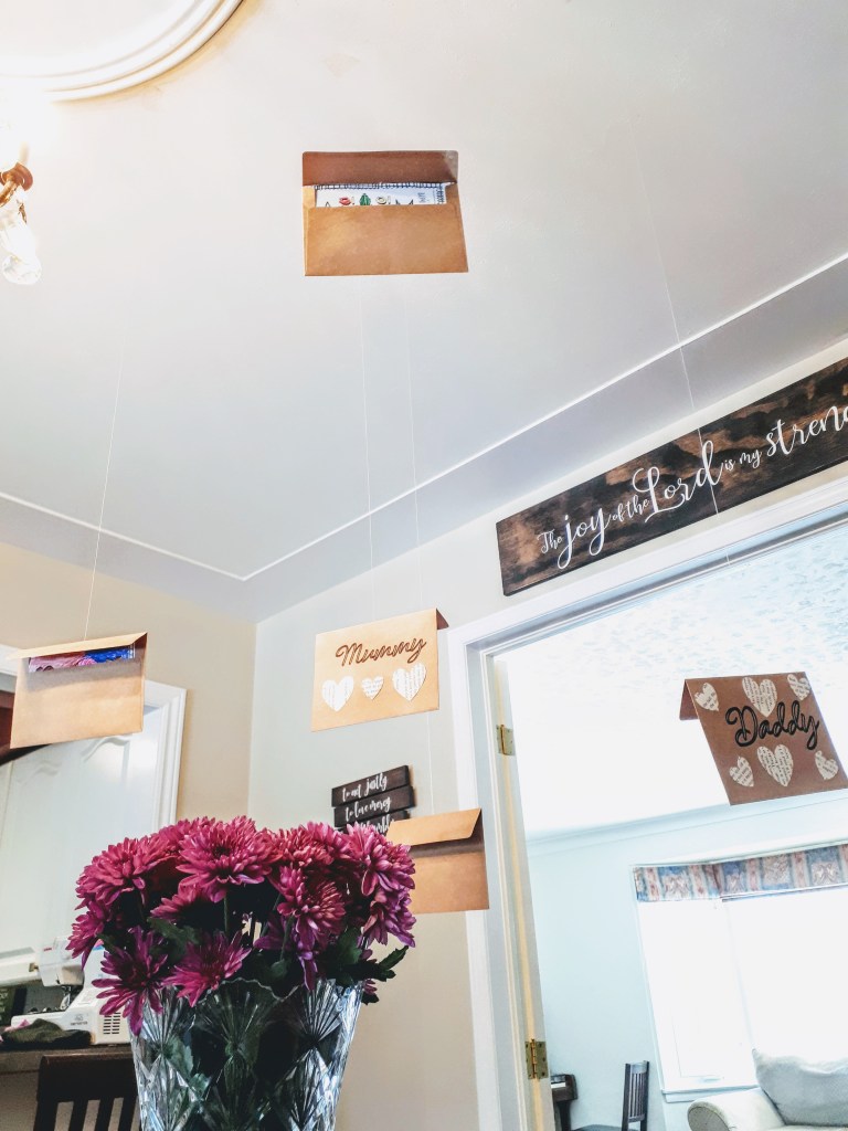 This, and many other sweet ideas (like serving strawberry milk), came from Melissa at Modern Honey. You can check out her full post by clicking here. I used my Cricut to write on the envelopes (because I am not a hand-lettering kind of girl. I have deplorable hand writing!), glued on cut-out hearts from an old book (see No-Sew Hardcover Book Purse for that story), and then hung them from the ceiling with fishing line and tape. And now you’ll need some Valentine’s Day cards to put in them!
