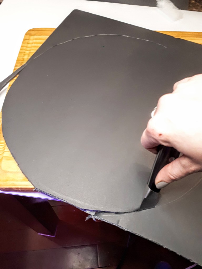 3. Find something kind of comparable to the size of your head, and then manipulate it to make more of an oval shape (again, see note on measuring above! If I’m confusing you take a look at the YouTube video. I talk about how to manipulate it and show you how I did it.). Cut it out. The large circle will become the brim of your hat, and the small circle will become the top of your top hat.